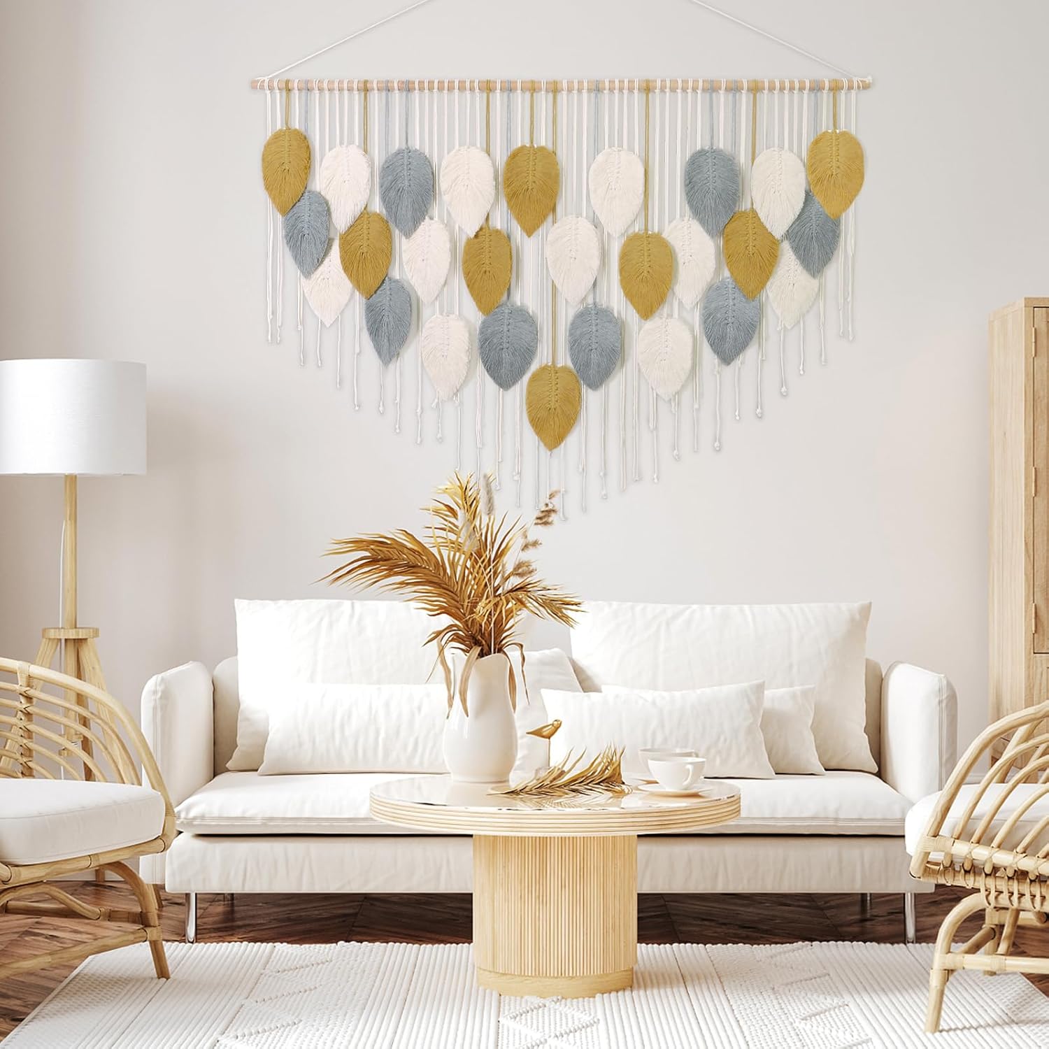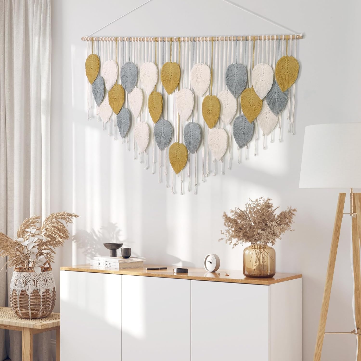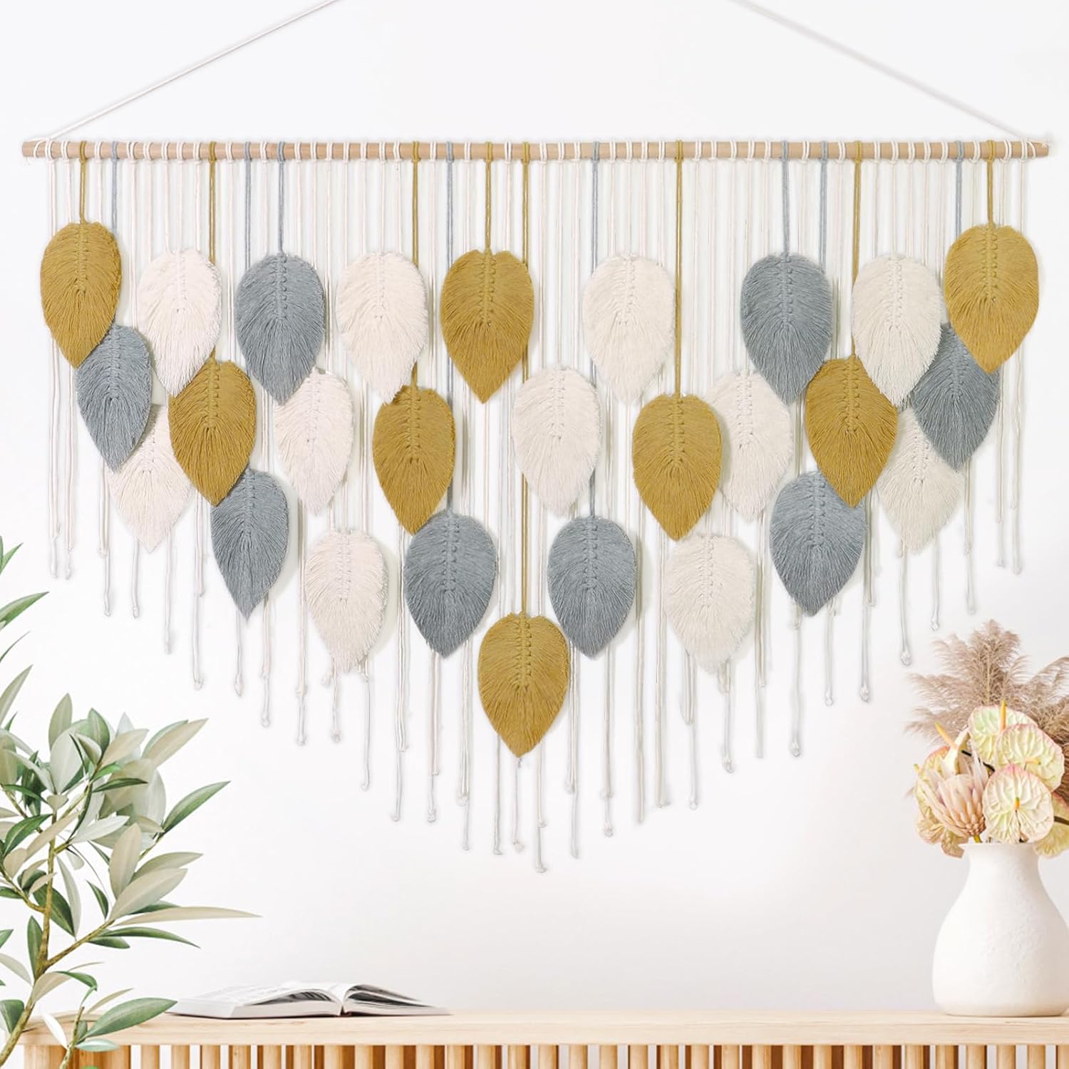 - 【Premium Quality Macrame】: Unique boho room decor, this meticulously woven wall hanging macrame with beautiful weaving leaves is made of natural rope,which knotted on the wooden dowel,and features fringe accents.