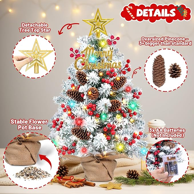 - 【24-Inch Snow Flocked Tabletop Christmas Tree - Full & Festive】This 24-inch mini Christmas tree features 65 lush, snow-frosted PVC branches, bringing the charm of a snowy forest indoors. Included 6 large pinecones, 16 red berry clusters, and 16 gold ribbon bows. Topped with a glittery gold star and a “Merry Christmas” gold sign for a classic, cheerful holiday look