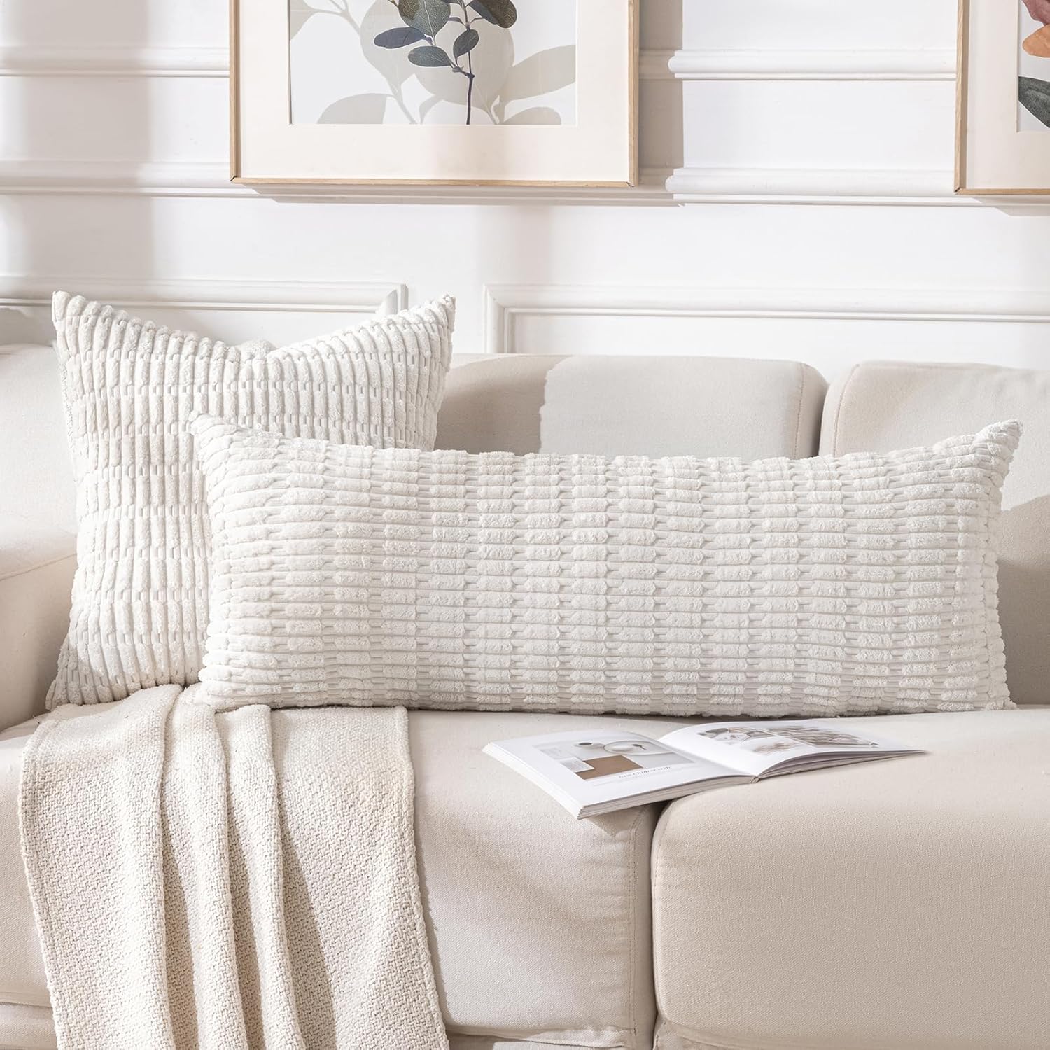 Fancy Homi Cream Boho Long Body Lumbar Decorative Throw Pillow Cover 14x36 Inch for Bed Couch Bedroom Bench, Soft Corduroy Rectangle Solid Pillow Case 35x91 cm, Rustic Farmhouse Room Decor