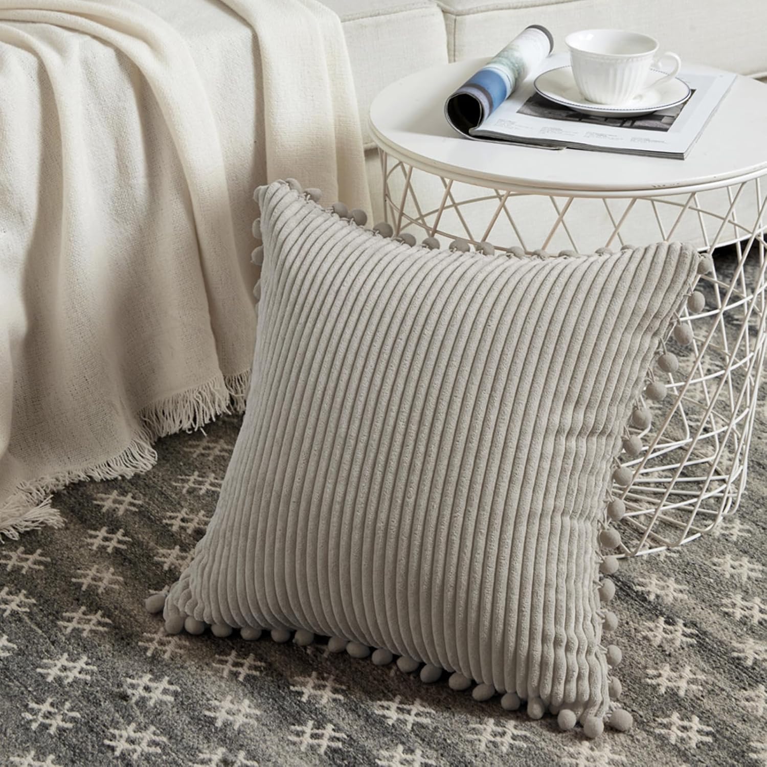 Fancy Homi 24x24 Pillow Covers, Pack of 2 Neutral Taupe Throw Pillow Covers with Pom-poms, Super Soft Corduroy Square Solid Cushion Cover for Couch Sofa Bedroom Living Room 60x60 cm