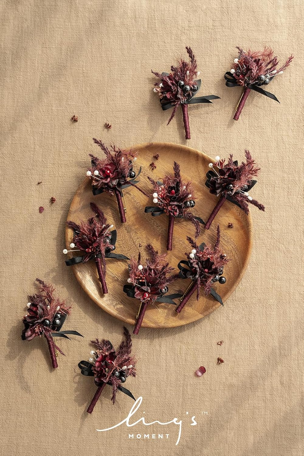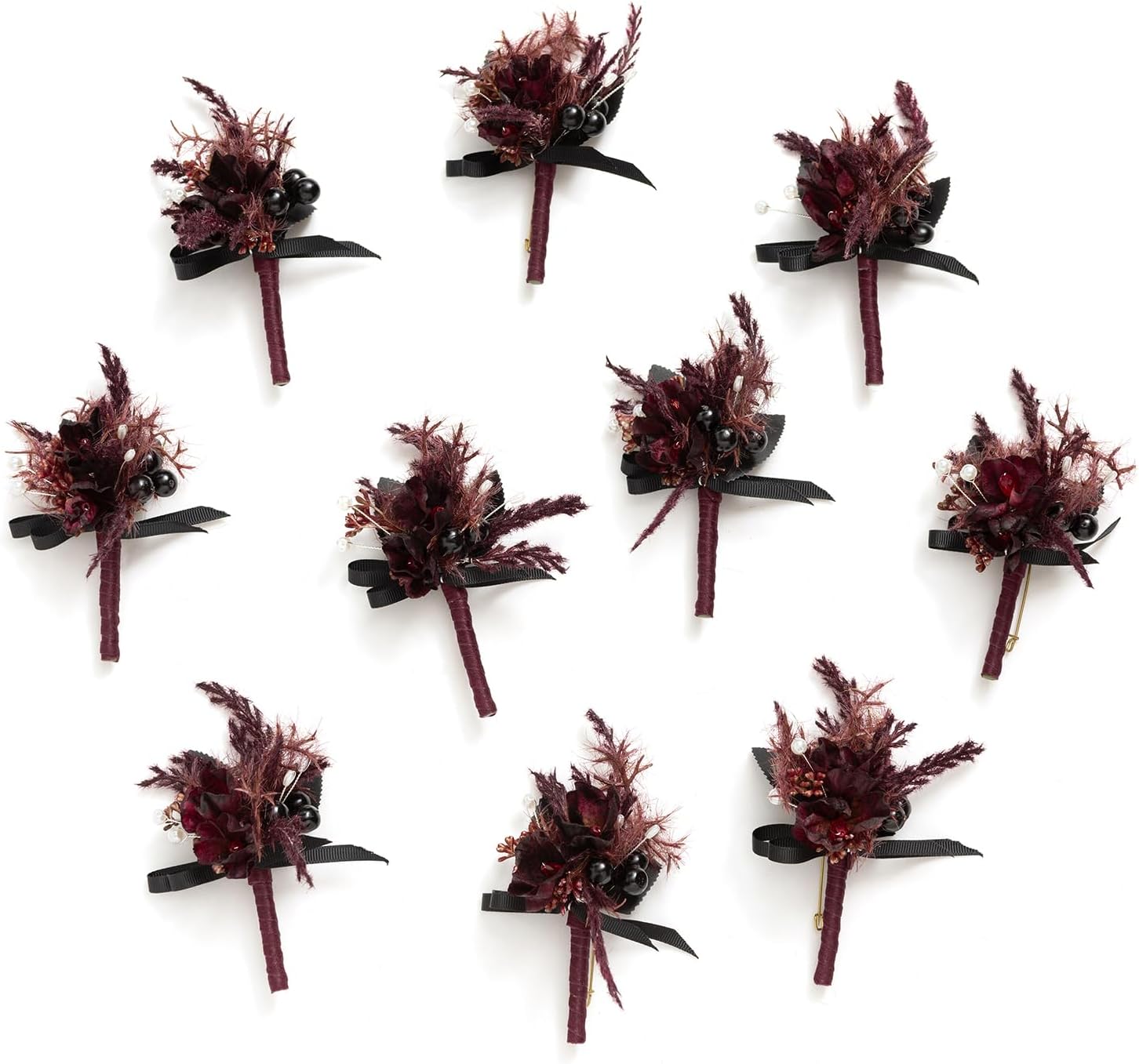 Ling's Moment Boutonniere for Men, 10pcs Groomsmen Guest Boutonniere, Artificial Flowers for Wedding Décor/Prom/Homecoming,etc.Black Gothic Burgundy