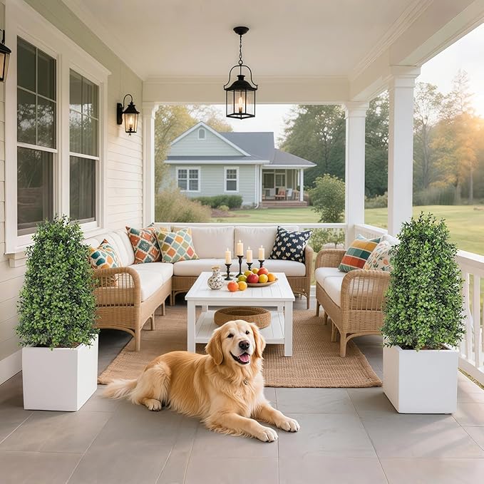 - 🌳【Pre-Potted and Ready to Use】Our faux topiaries are shaped like a tower, with two pieces per package. Each one is 30 inches tall and comes pre-potted in a black planter filled with concrete to ensure the stablity. Similarly, you can also place it in what you consider the most perfect flower pot or decorative planter, adding more fun and artistic style to it.