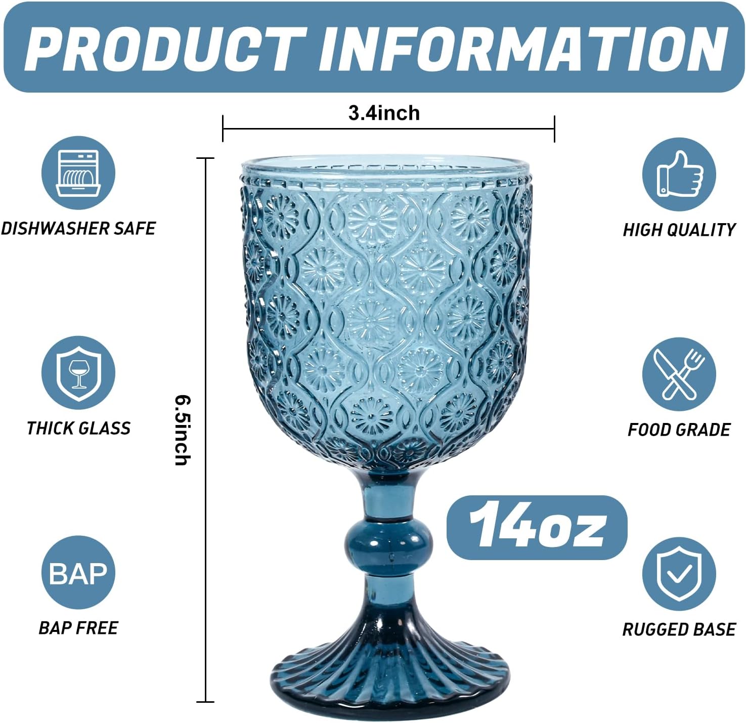 Colored Wine Glass Goblet Set of 6, 14 oz Blue Goblets Glassware, Blue Vintage Glassware for Weddings, Parties, Restaurants, Family Gatherings, Bars, Cafeterias, Dishwasher Safe