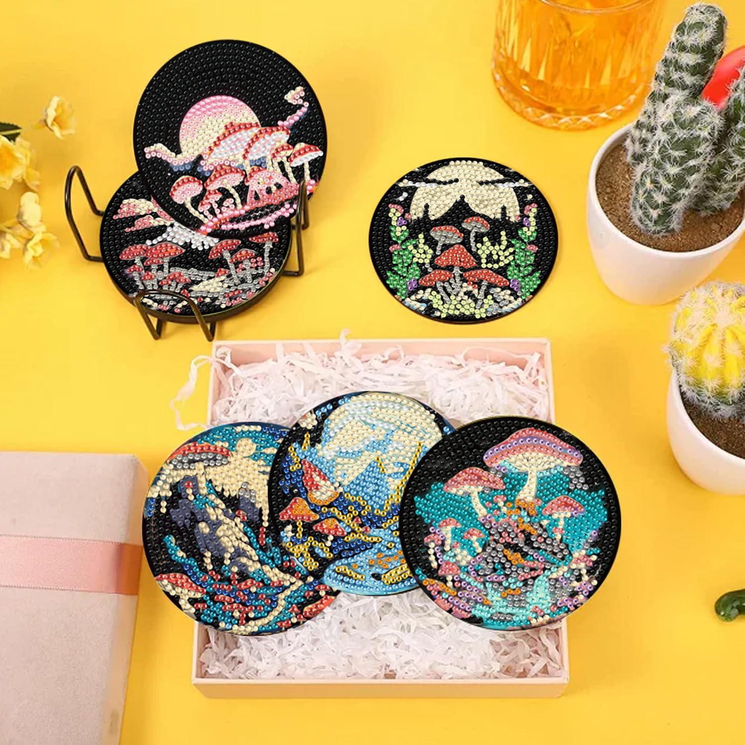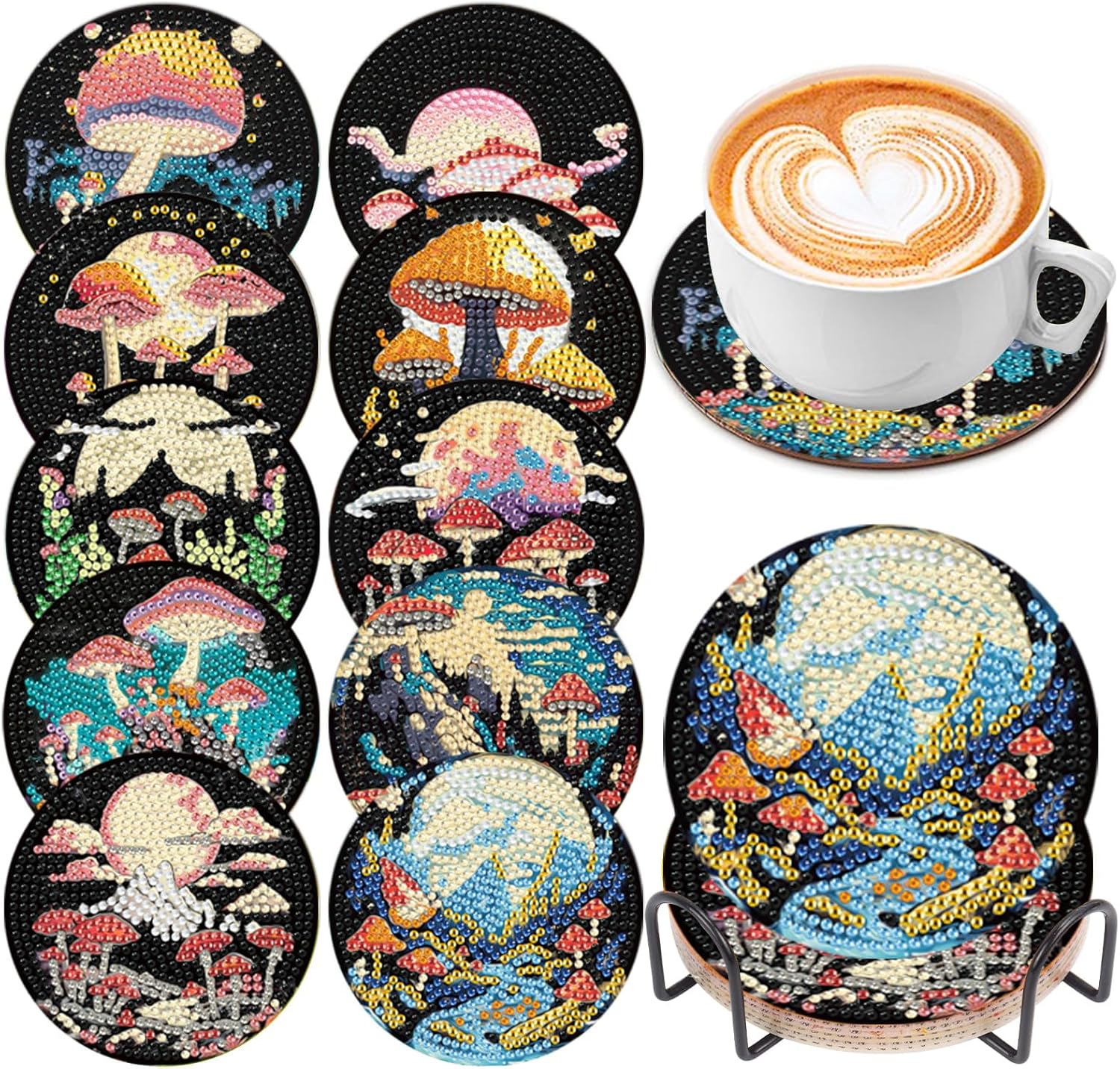 EWJRNSF 10 PCS Diamond Art Coasters Kit, Small Diamond Painting Coasters, Fall Diamond Art Kits for Adults Beginners, Arts and Crafts Supplies Item Sets with Holder Mushroom