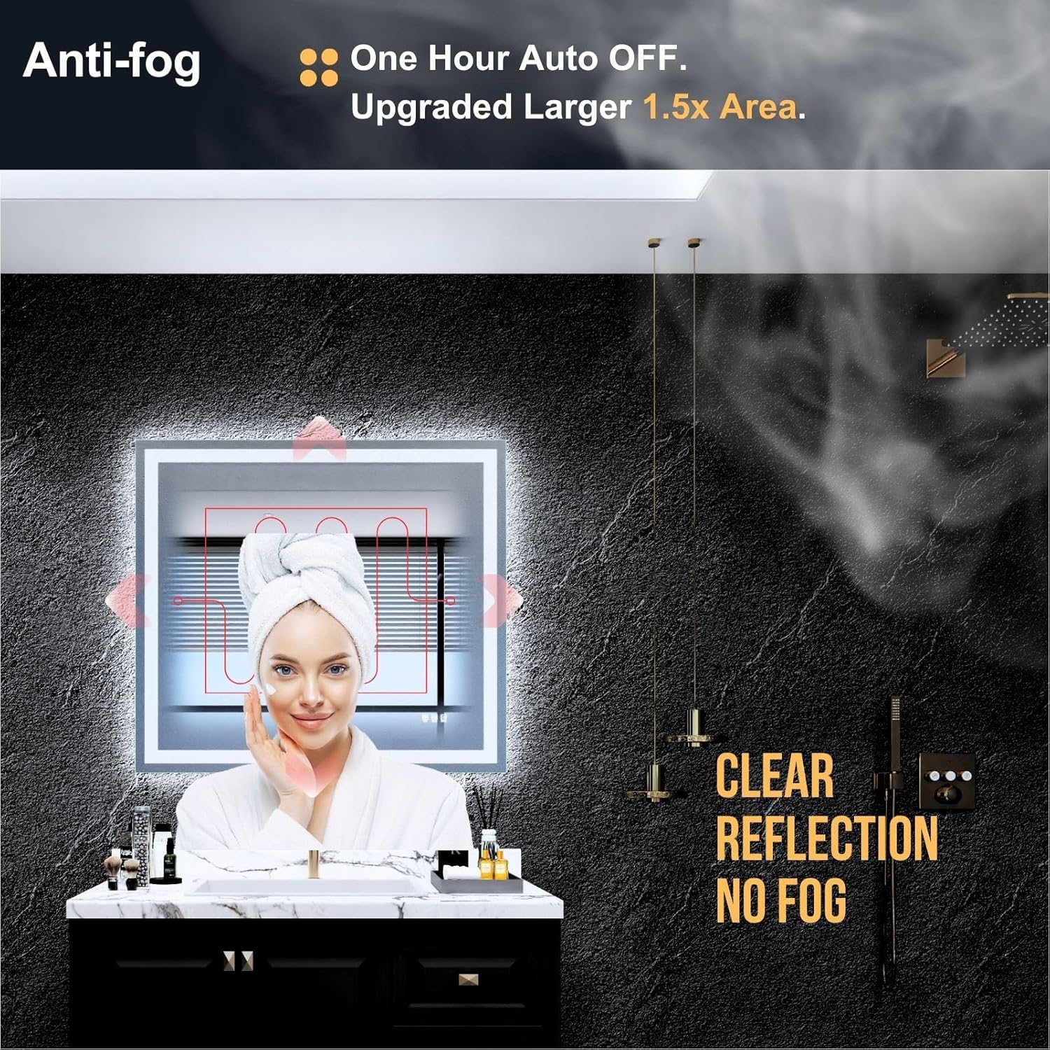 - 🛀🏻【Clear Reflection & No Fog】Our lighted vanity mirror ensures a fog-free reflection with powerful anti-fog surface. Automatically turns off defogging function after one hour to save energy. Waterproof and durable. Upgrade your bathroom with this advanced lighted mirror for bathroom!