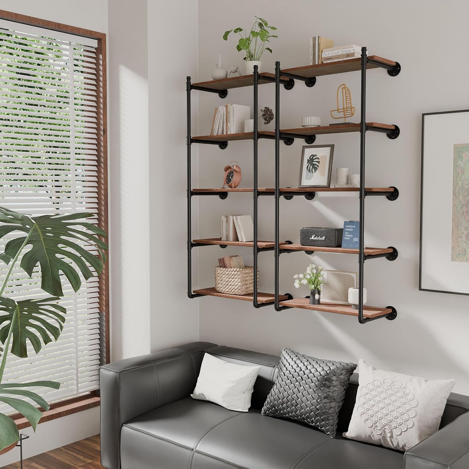 Industrial Pipe Shelf Brackets Wall Mount,Open Black Pipe Shelving for Kitchen,Floating Shelf Brackets Mount,Open Bookshelf Brackets for Shelves,Wall Shelves 12 Inch Deep(2PcsX5Tier,61" Tall)