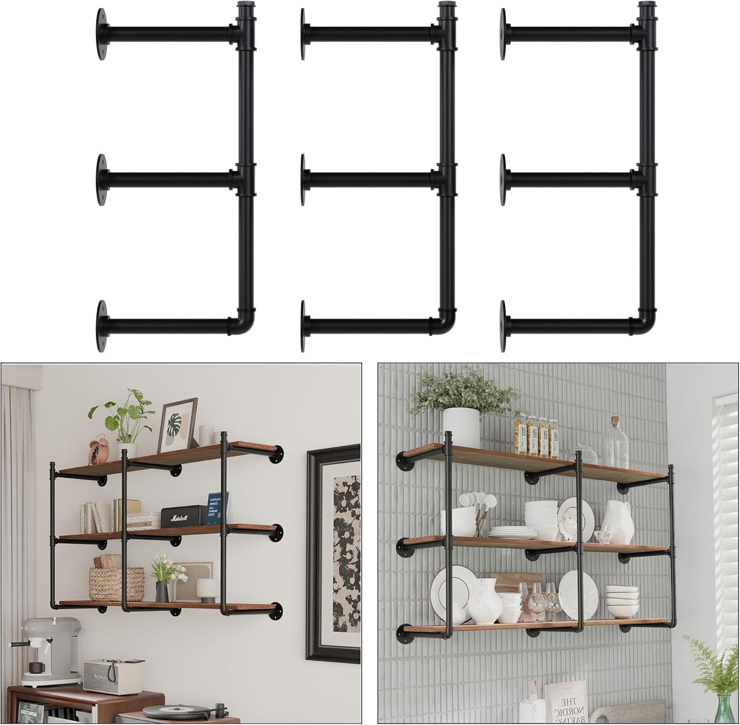 Industrial Pipe Shelf Brackets Wall Mount,Open Black Pipe Shelving for Kitchen,Floating Shelf Brackets Mount,Open Bookshelf Brackets for Shelves,Wall Shelves 12 Inch Deep,(3PcsX3Tier,32" Tall)