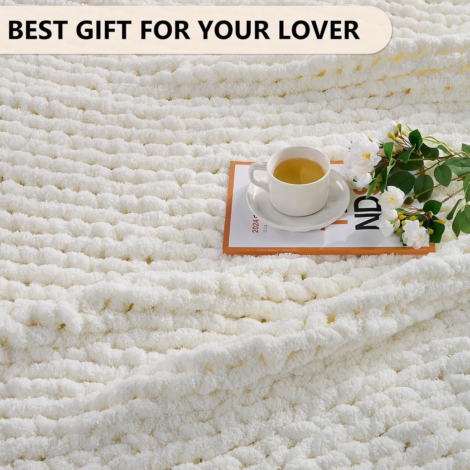 L'AGRATY Chunky Knit Blanket Throw: 72''x84'' Chenille Chunky Knitted Throw Blanket for Bed Couch - Handmade Thick Big Cable Knit Blanket - Large Chunky Crochet Blanket for Home Decor(Cream White)