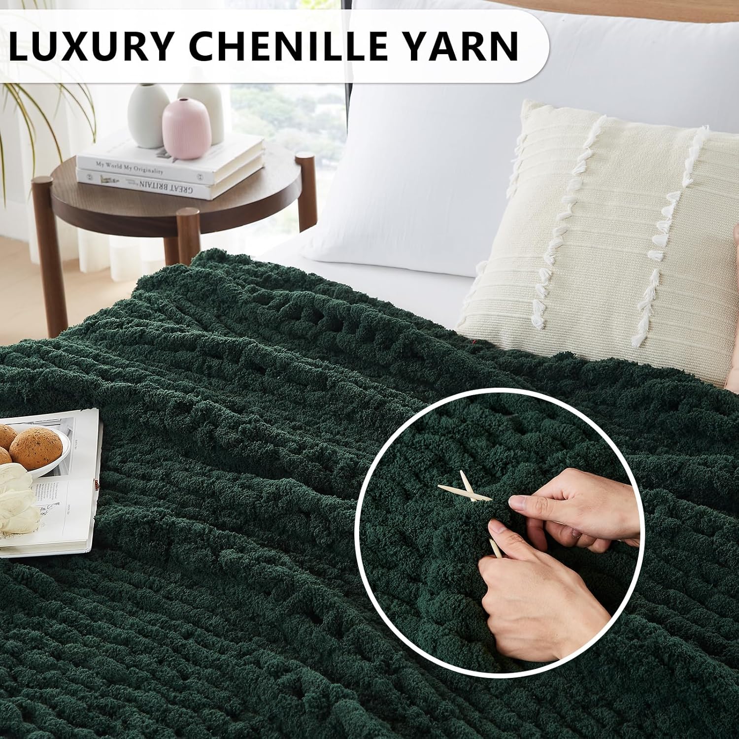 L'AGRATY Chunky Knit Blanket Throw: 80''x90'' Chenille Chunky Knitted Throw Blanket for Bed Couch - Handmade Thick Big Cable Knit Blanket - Large Chunky Crochet Rope Blanket for Home Decor(Green)