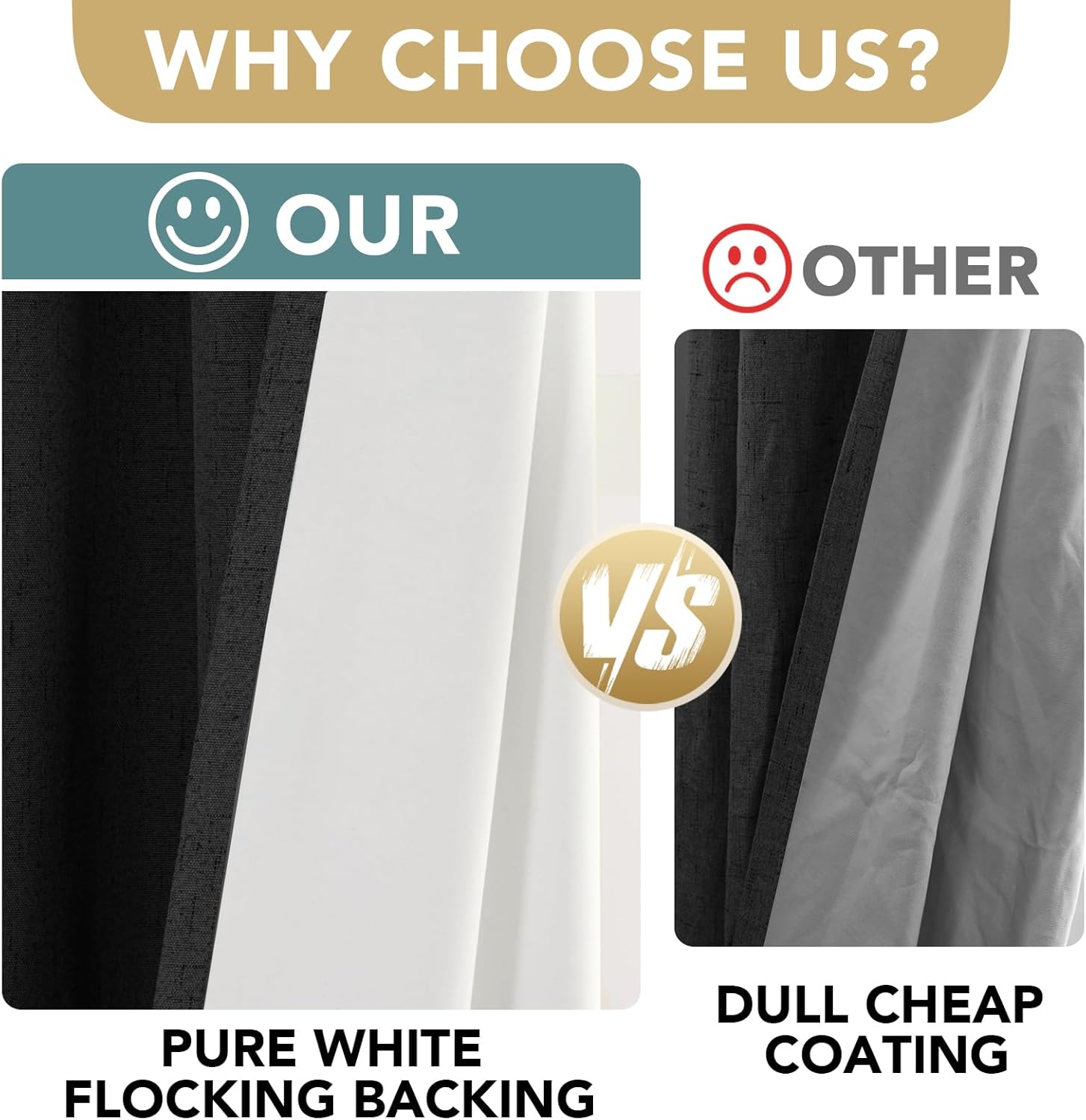 - INNOVATED MATERIAL: These casual linen draperies are crafted from rich linen like fabric (100% polyester), added with 100% blackout lining, draped and soft, block the wind and reduce the noise. Lab test shows these awesome curtain panels are environmental and vinyl free