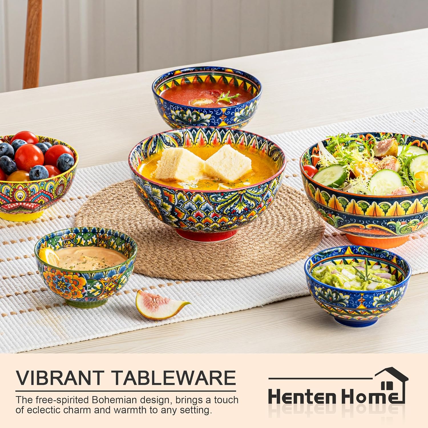Henten Home 6.5 oz Small Dessert Bowls, Porcelain Boho Snack Bowl Set of 6 - Ceramic Colorful Bowls for Salsa, Dipping, Sauce, Decorative, Microwave & Dishwasher Safe