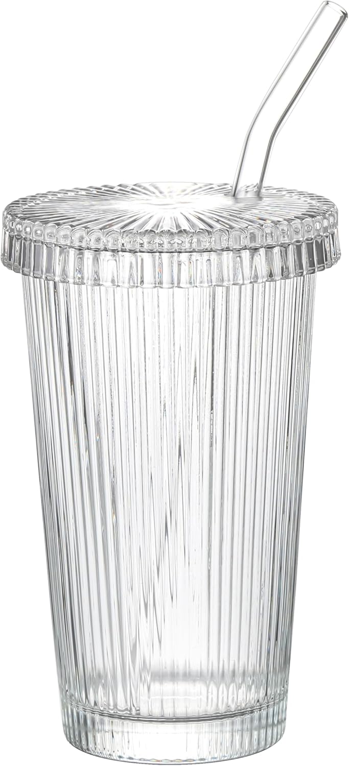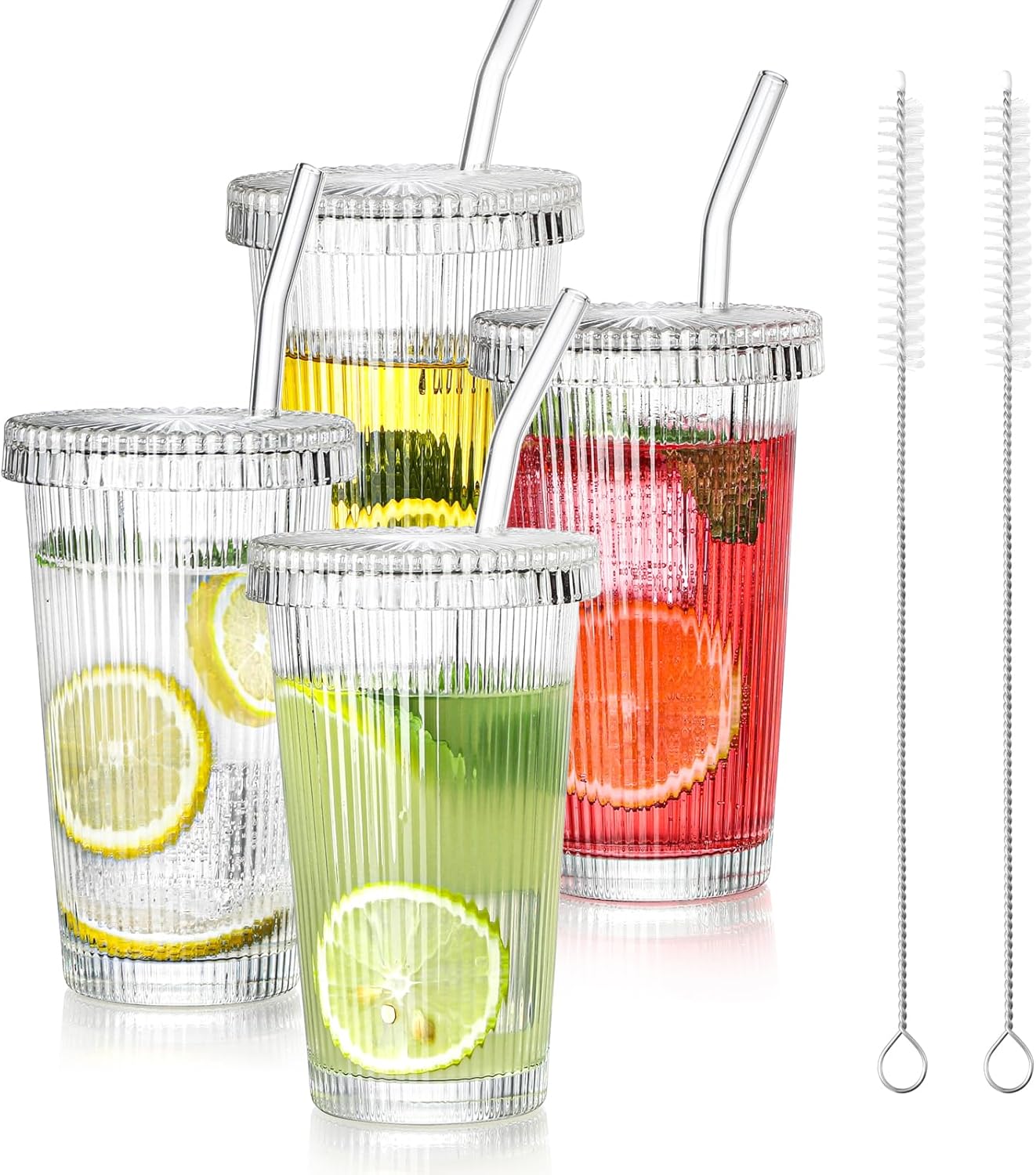 Drinking Glasses Set of 4,Ribbed Cocktail Glasses Set,Origami Style Water Glass Cups with Lids,Straws and 2 Straw Brushes for Iced Coffee, Juice,Smoothie
