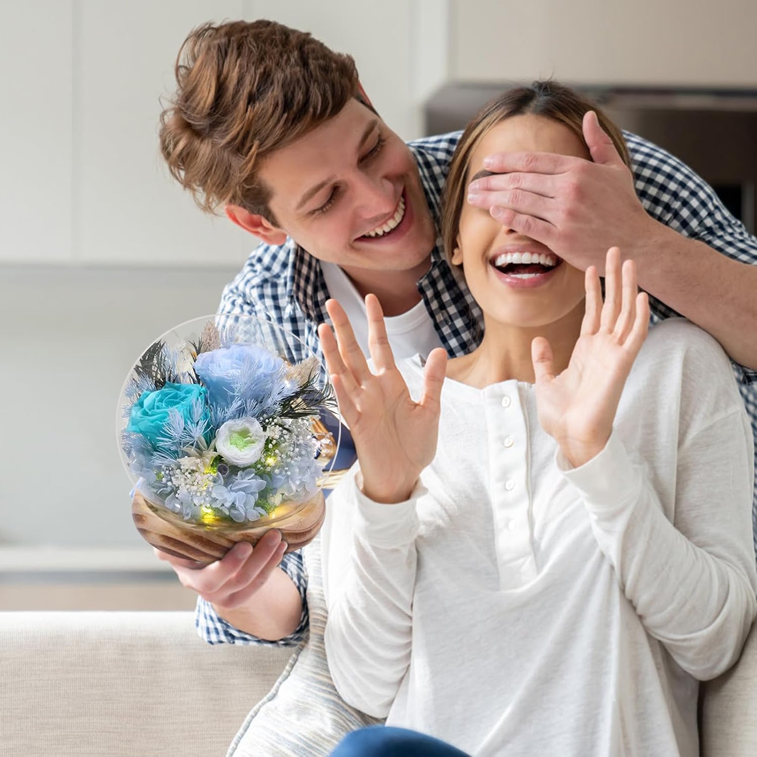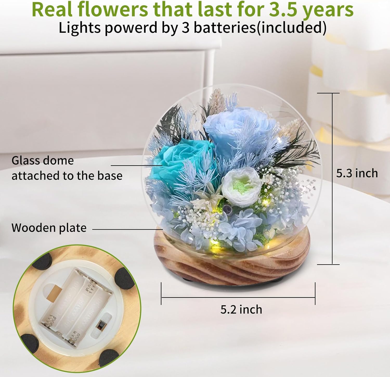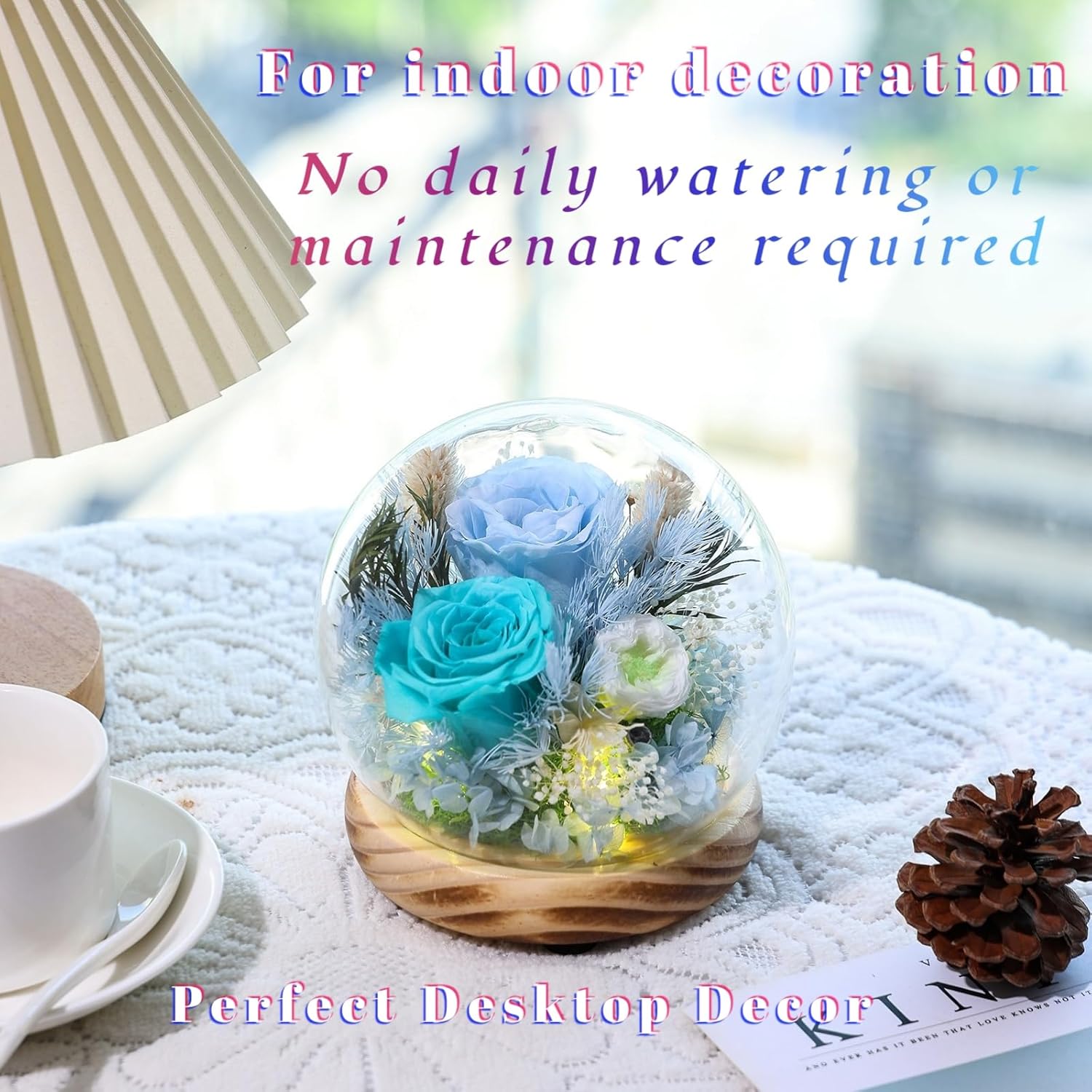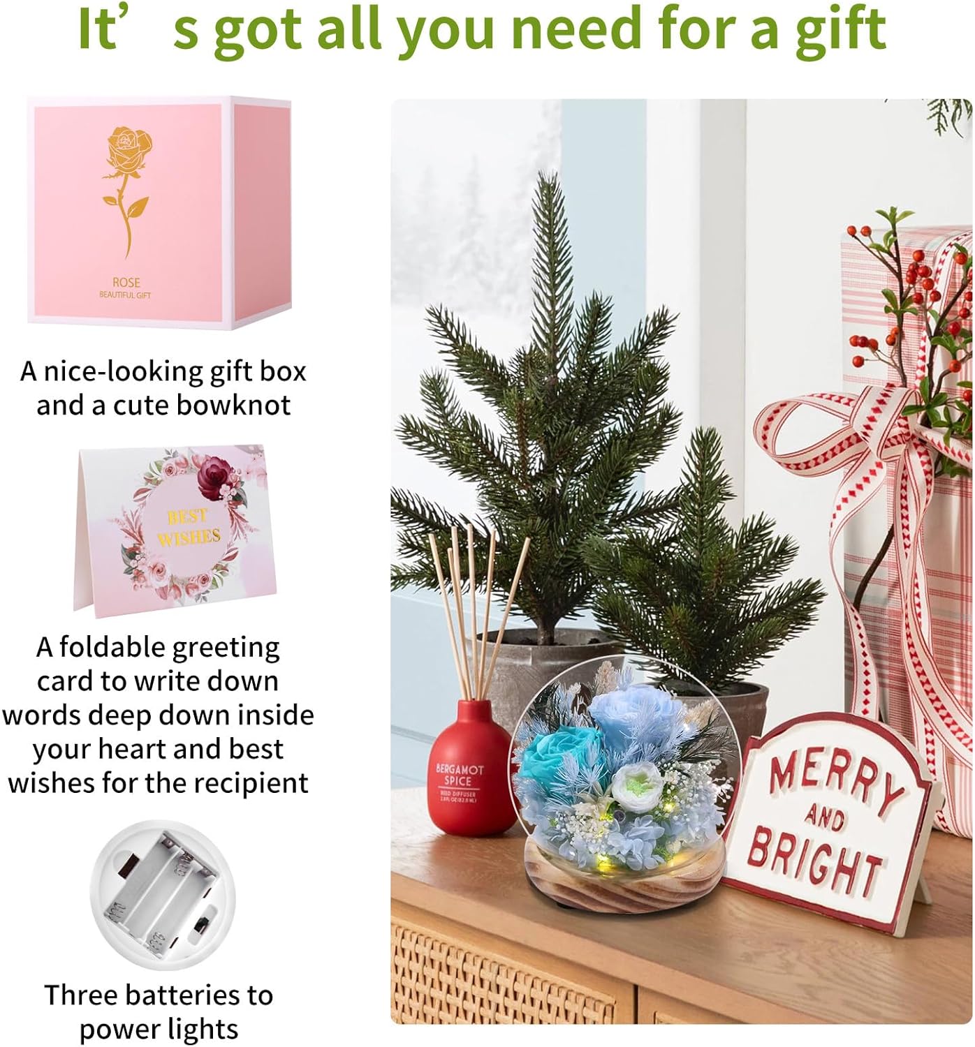 Long-lasting real flowers,Preserved Rose in Glass Dome with Hydrangea and LED Light,Roses Gifts for Women Mom Her Grandma on Mothers Day Birthday Valentines Day Christmas Thanksgiving(Aqua&Blue Rose)
