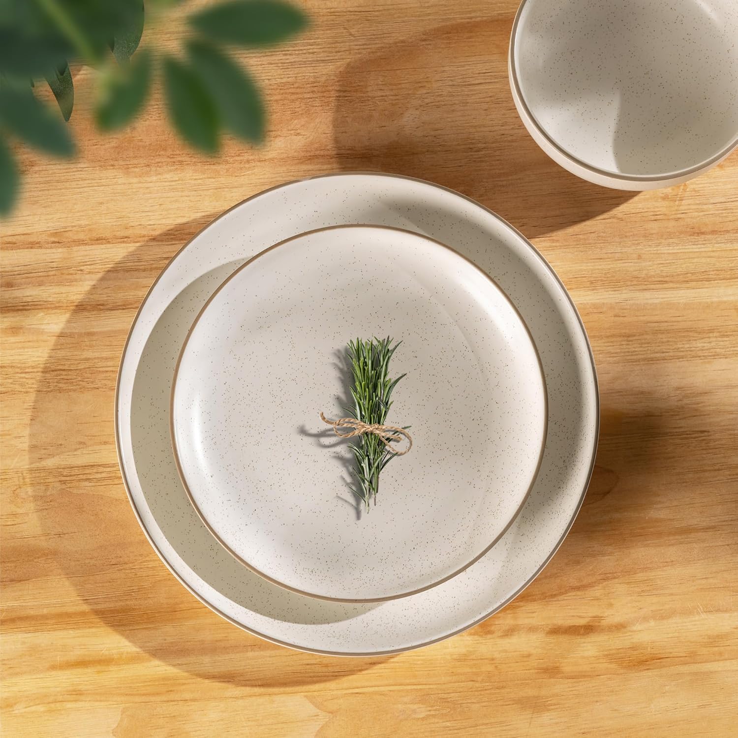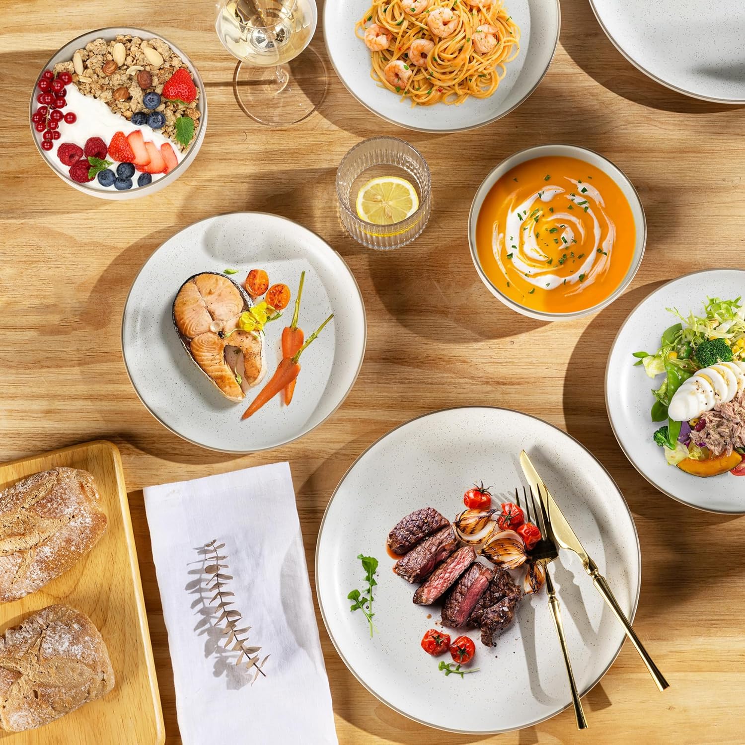 - ăUNIQUE MODERN DESIGNăElaborated and designed by the artist, our MATTE speckles glaze and hand-painted RUSTIC edges are distinctive. The whole ceramic dinnerware set features a modern and elegant unique design, adding a touch of elegance and sophistication to your table settings. This white dinnerware set is durable enough for everyday use for the family, yet sophisticated enough for that important formal occasion or dinner party. Perfect for wedding and housewarming gifts as well