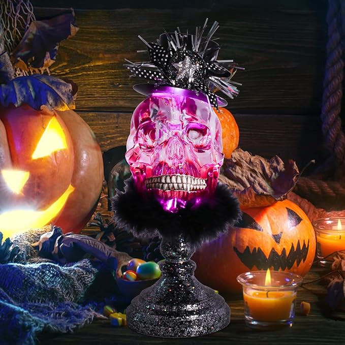 VCUTEKA Halloween Skull Head Light Indoor Decoration Skull Statue Halloween Sculptures with Magic Hat for Party Horror Decoration Holiday Decor Figurines Gift
