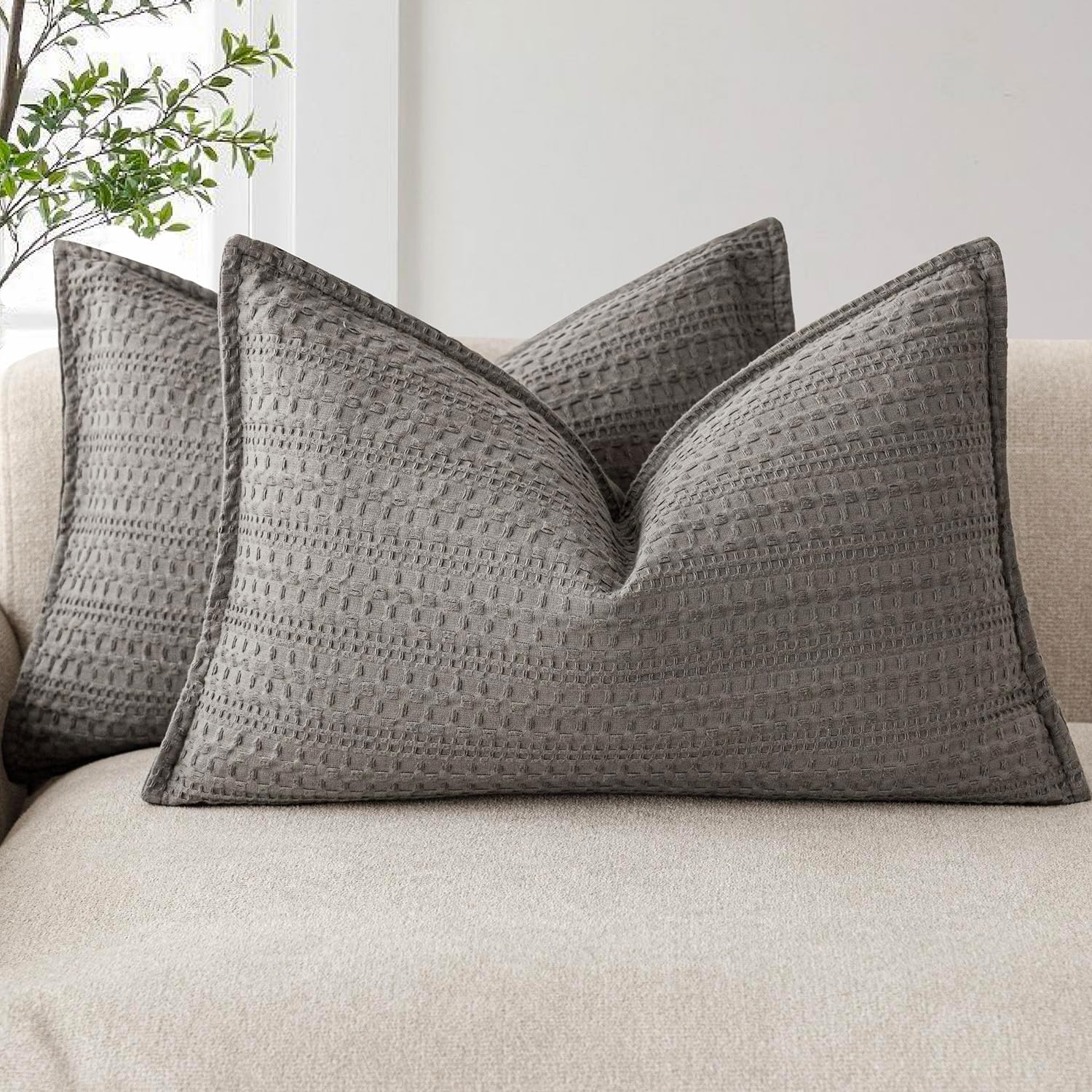 Foindtower Set of 2 Decorative Cotton Waffle Weave Lumbar Throw Pillow Covers Euro Shams Cushion Covers Accent European Pillowcase for Bed Couch Bedroom Living Room Home Decor 12×20 Inch Taupe Gray