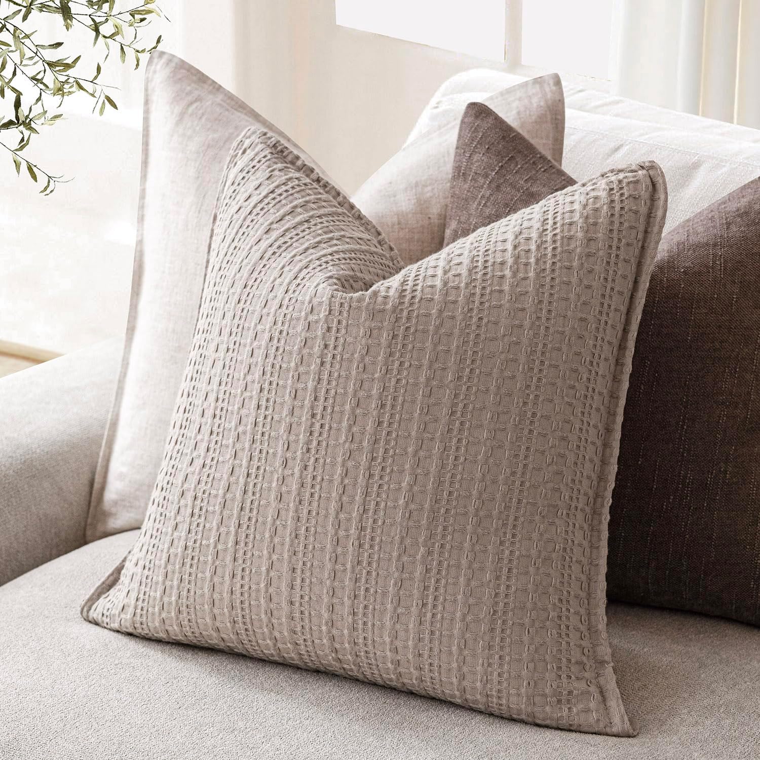 Foindtower Set of 2 Decorative Cotton Waffle Weave Throw Pillow Covers Euro Shams Cushion Covers Accent European Pillowcase for Bed Couch Sofa Bedroom Living Room Home Decor 20×20 Inch Tan Beige