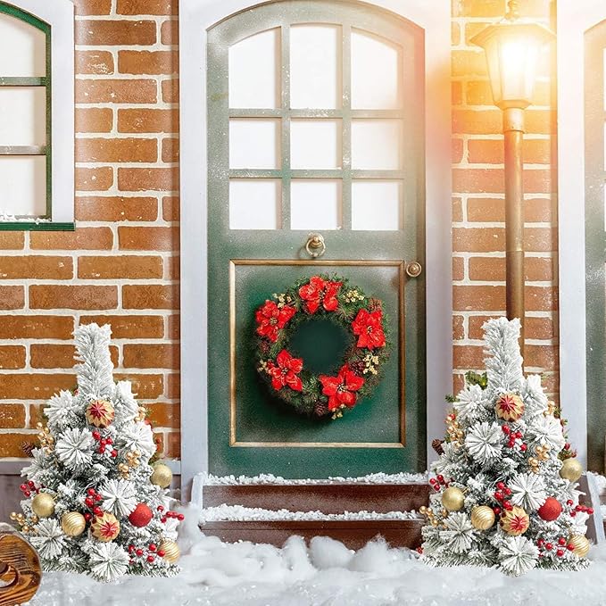 24'' Mini Artificial Christmas Tree with LED Lights and Faux Berrys, PreLit Snow Flocked Xmas White Trees, Christmas Porch Small Fake Trees for Outdoor, Home, Porch & Yard - Set of 2
