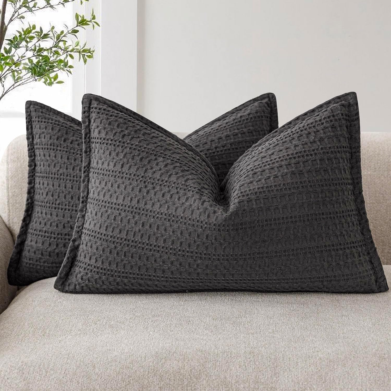 Foindtower Set of 2 Decorative Cotton Waffle Weave Lumbar Throw Pillow Covers Euro Sham Cushion Covers Accent European Pillowcase For Bed Couch Sofa Bedroom Living Room Home Decor 12×20 Inch Dark Grey