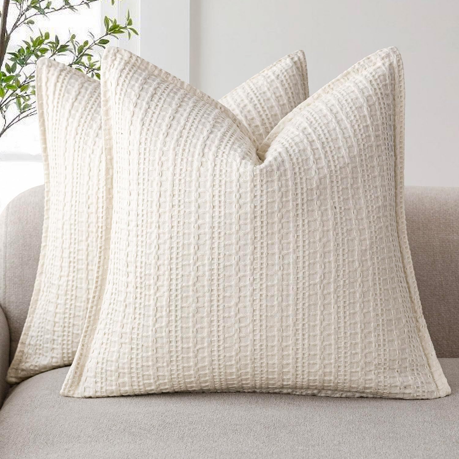 Foindtower Set of 2 Decorative Cotton Waffle Weave Throw Pillow Covers Euro Shams Cushion Covers Accent European Pillowcase for Bed Couch Sofa Bedroom Living Room Home Decor 24×24 Inch Natural Ivory
