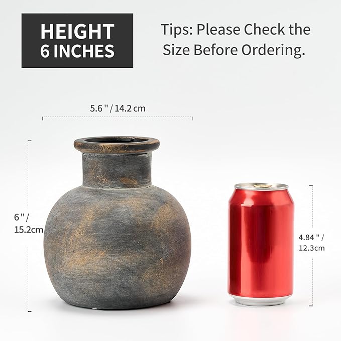 - ๐๐๐๐ฌ๐ฎ๐ซ๐๐ฆ๐๐ง๐ญ๐ฌ: The rustic vase measures 6" height and 5.6" width with 2.4" opening.Perfect for greenery and dry or faux florals,but also can hold water for fresh flowers.The vase itself can be displayed indoors or outdoor as a fine decorative piece.