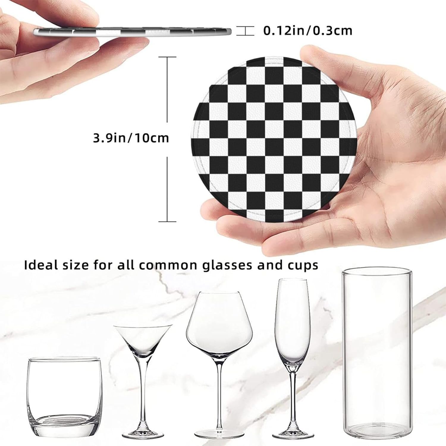 Drink Coasters with Holder Stand Set of 6 Black and White Checkerboard Pu Leather Absorbent Coasters with Cork Base Table Round Coaster for Housewarming Apartment Kitchen Bar Decor