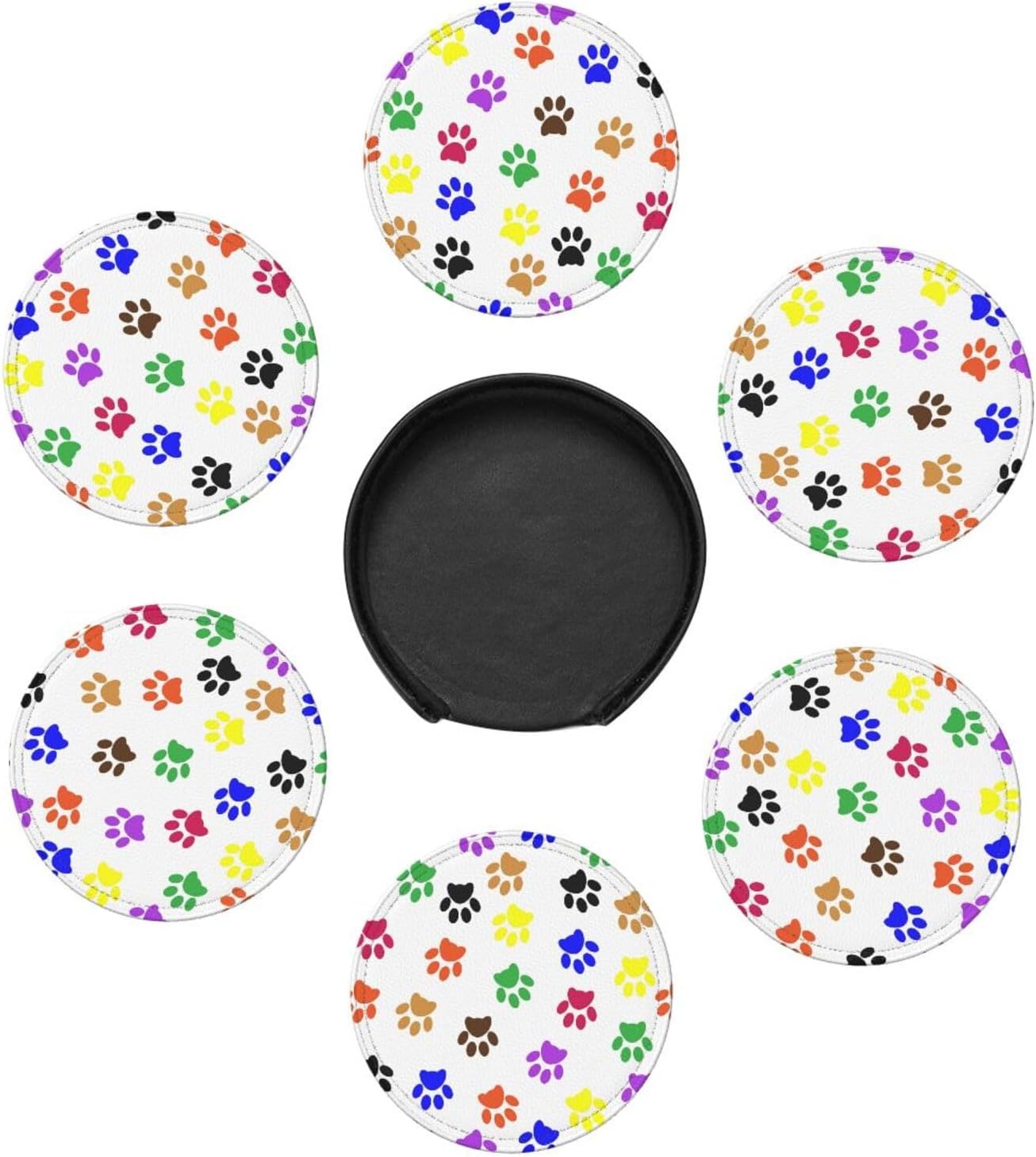 Drink Coasters with Holder Stand Set of 6, Dog Cat Paws Pu Leather Absorbent Coasters with Cork Base Table Round Coaster for Housewarming Apartment Kitchen Bar Decor