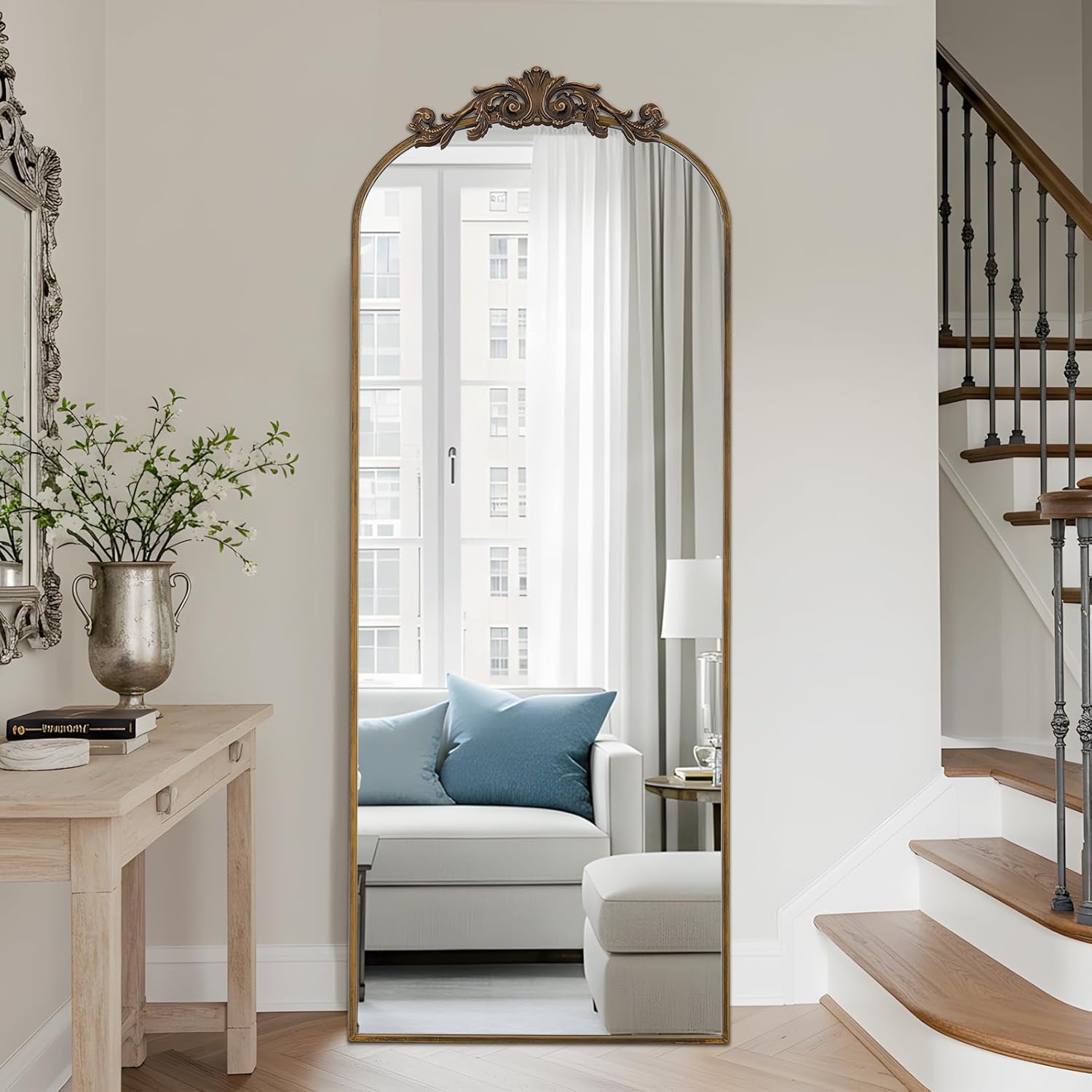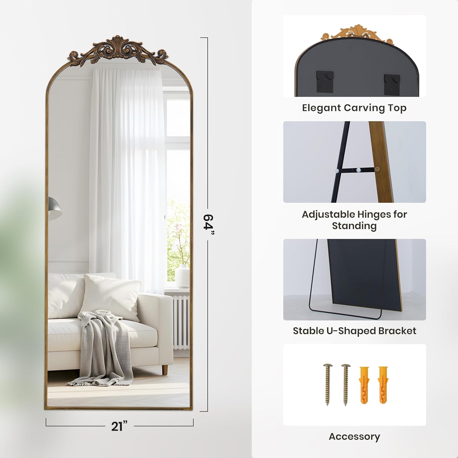 - Bronze Aluminum Alloy Framed Floor Mirror with Vintage Ornate Carved Applique: The full length standing mirror features a modern style that can complement any type of room decor, adding a touch of elegance to your room, move light around and create the illusion of depth and space. This full body mirror with sleek looking is also great for selfies or pictures in general