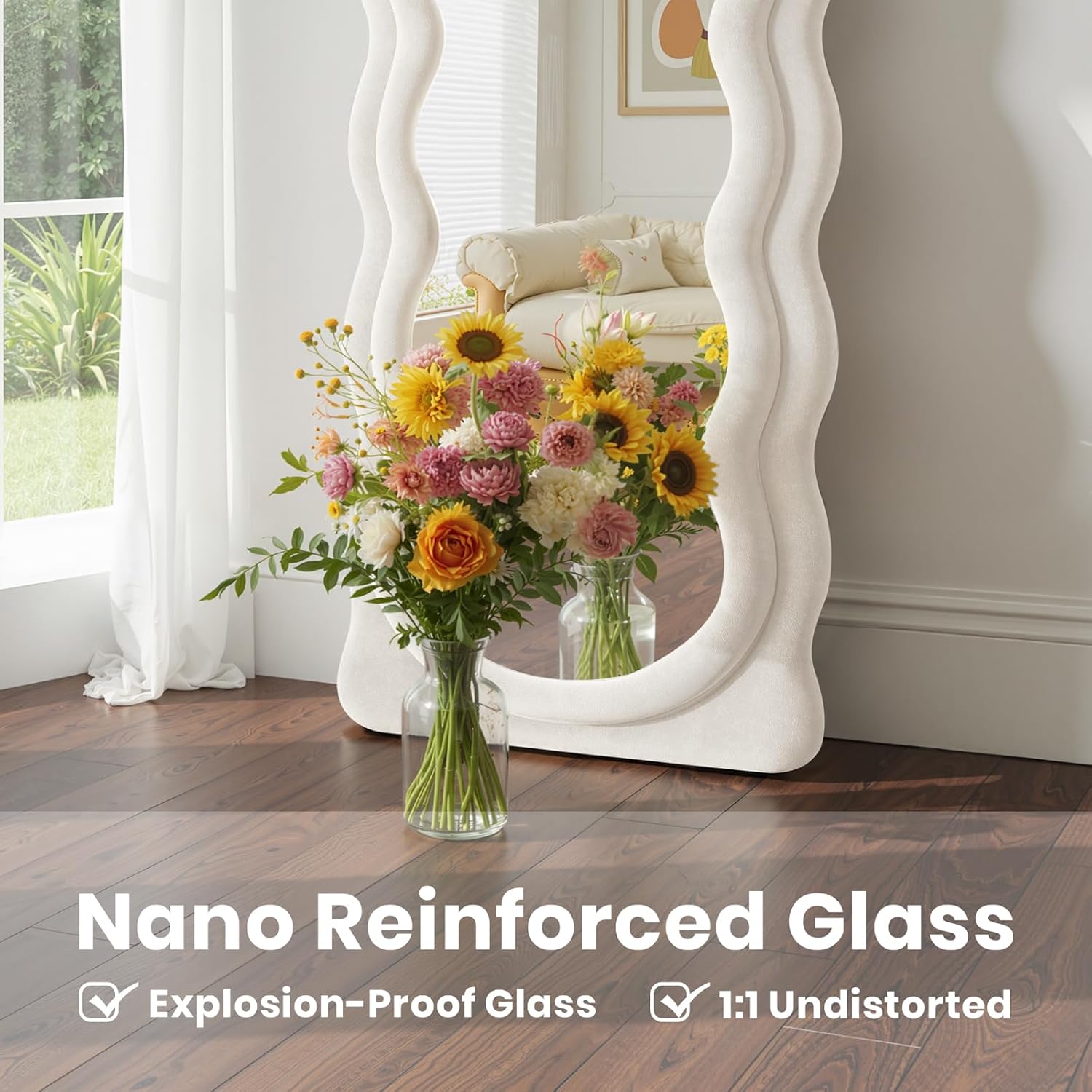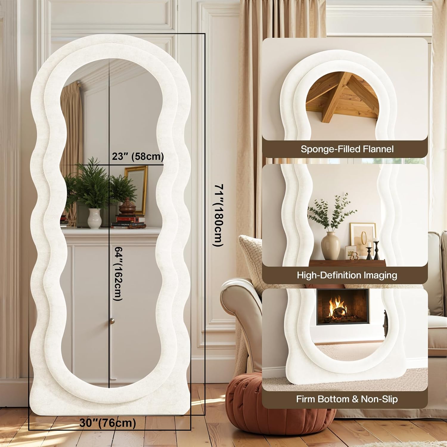 - Ivory Flannel Irregular Wavy Frame Floor Mirror: The full length standing mirror features a modern style that can complement any type of room decor, adding a touch of elegance to your room. It will be a great wall decor art piece for your home. This full body mirror with sleek looking is also great for selfies or pictures in general