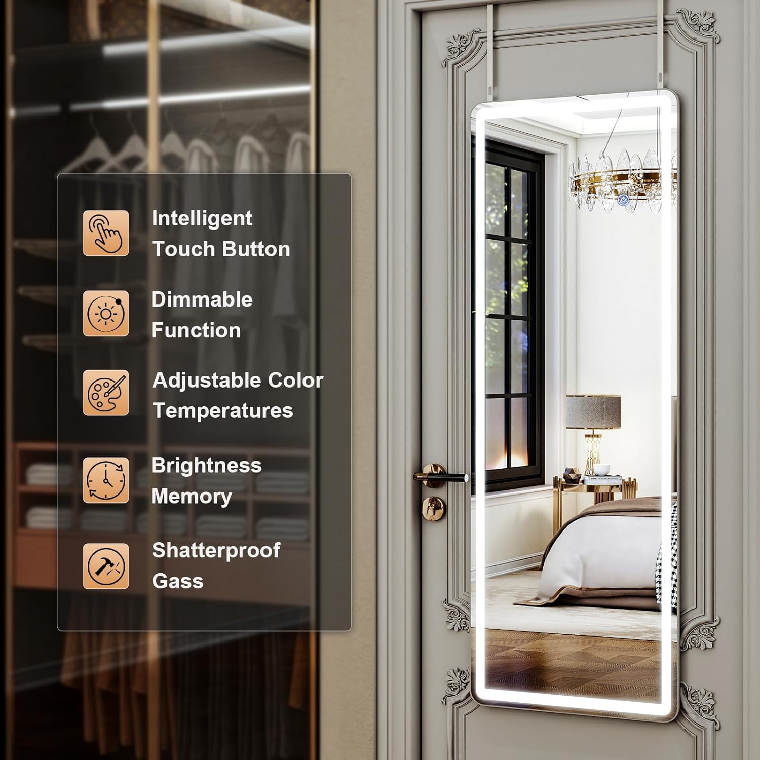 LED White Round Corner Door Hanging Full Length Mirror - 16“ x 48” Adjustable Brightness, Touch Screen Controls, Wall Mounted for Bedroom, Living Room, Cloakroom Dressing Mirror