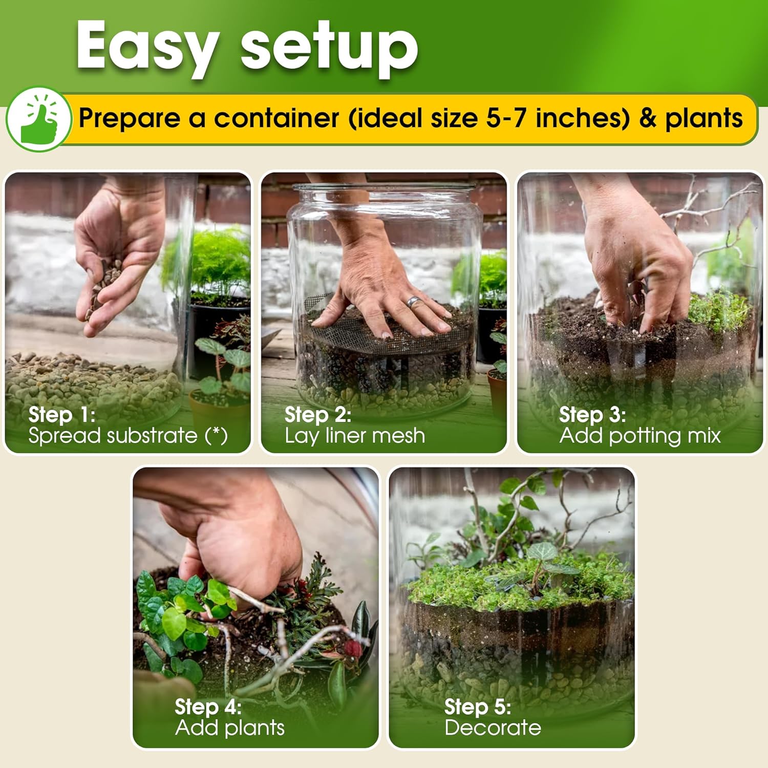- π± πππ-ππ-πππ πππππππππ πππ: The rainforest terrarium kit comes with everything needed to set up a healthy terrarium, including premium 5-blend soil mix for proper drainage, nutrient supply for plants and oxygen supply for roots; a substrate layer with mesh to facilitate aeration and water holding; sphagnum moss for moisture and nutrient retention; and lastly, decorative materials to enhance aesthetic appeal. These closed terrarium kits also include maintenance tools and detailed instructions, making it effortless for beginners to create a complete terrarium landscape.