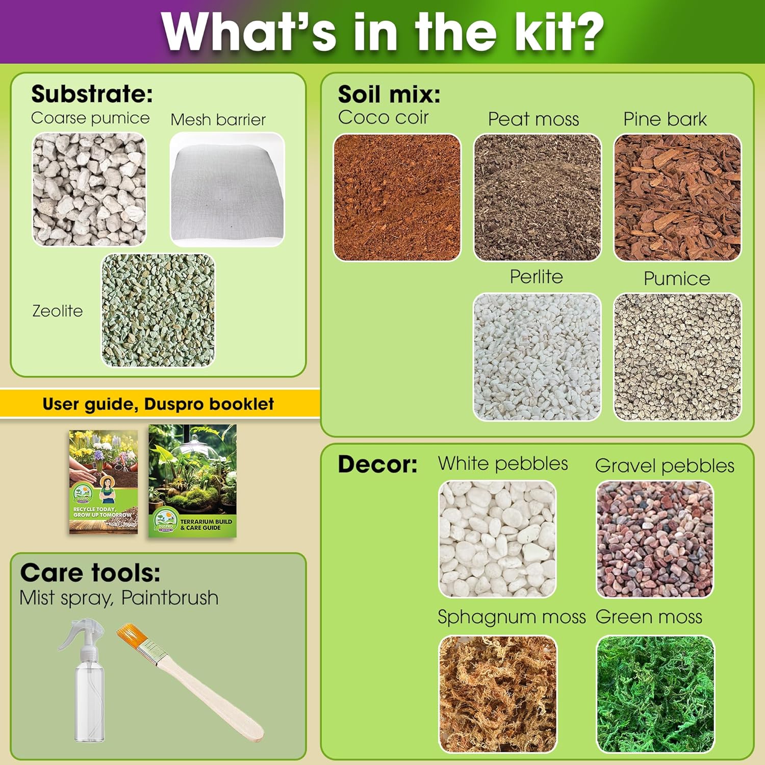 DUSPRO Recycle Terrarium Kit, Include Potting Soil, Pumice, Zeolite, Green Moss, Sphagnum Moss, Decorative Stone, Mesh, Tools, DIY Terrarium Kit for Kids, Air Plant, Succulent
