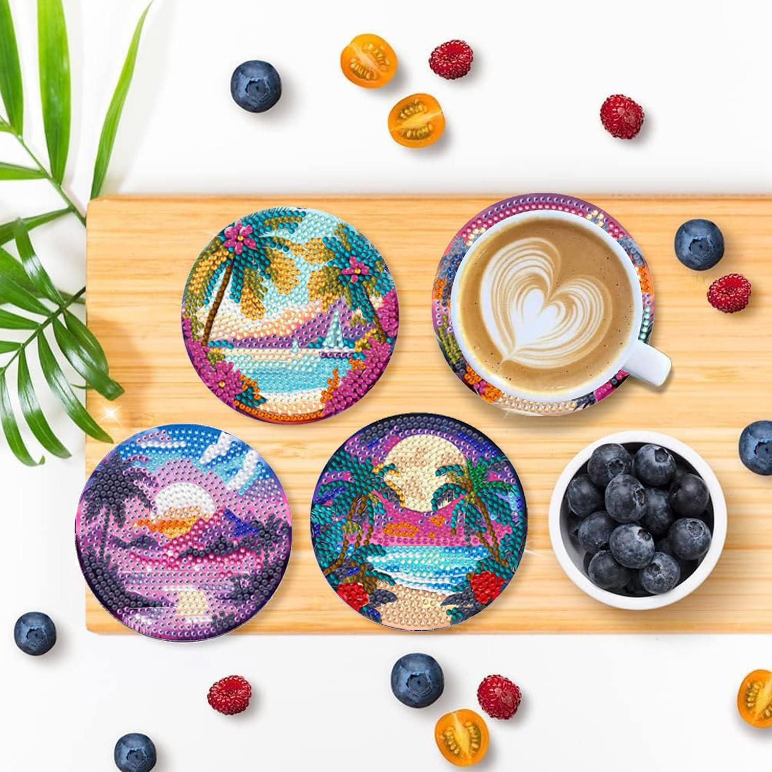 EWJRNSF 6 PCS Small Diamond Art Coasters Kits, Diamond Painting Coasters, Fall Diamond Art Kits for Adults Beginners, Arts and Crafts Item Sets with Holder for Drinks. Ocean Beach