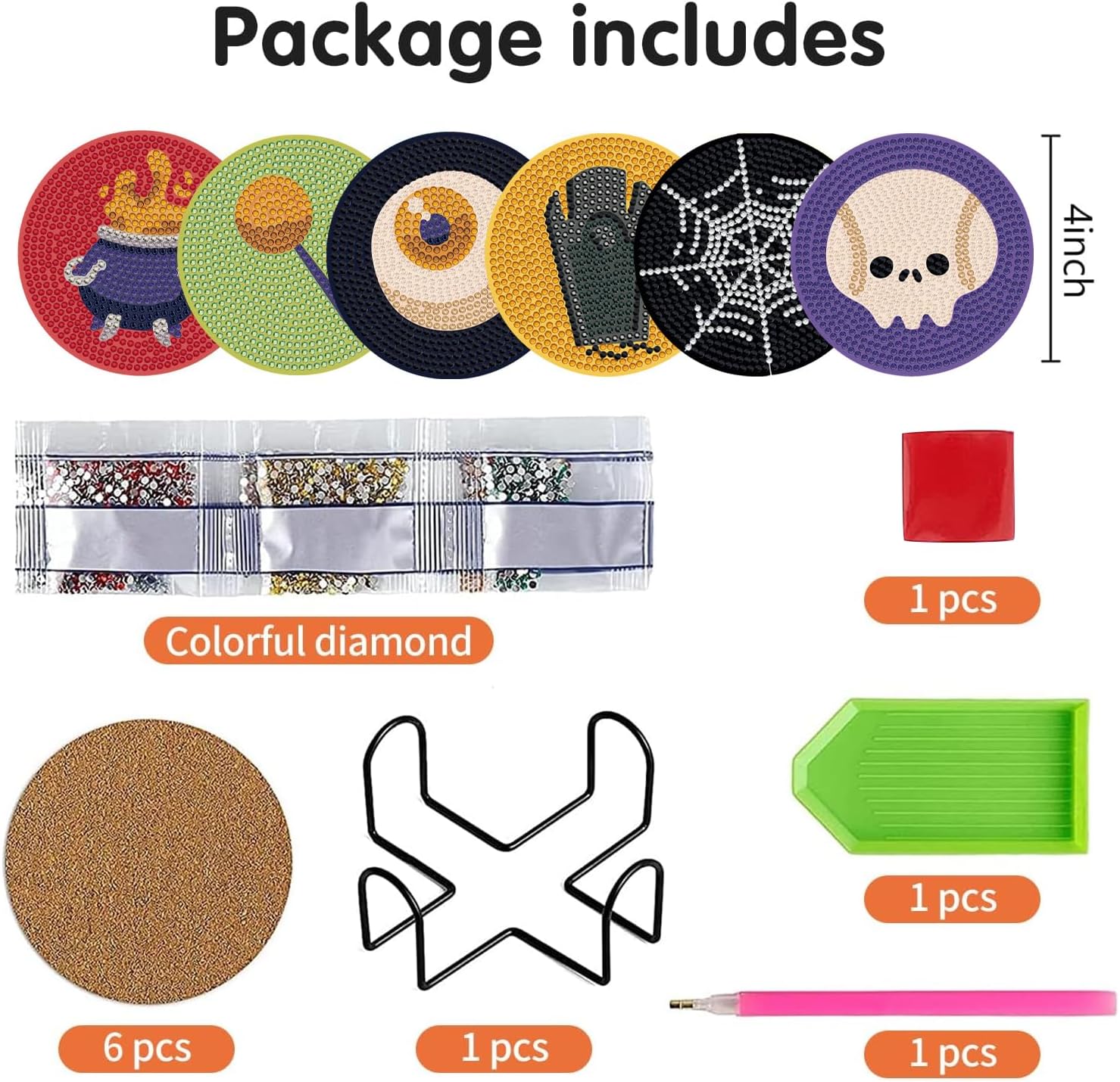 - Complete Set - Package includes 6 Halloween Diamond Art Coasters, 6 Cork Pads, 1 Coaster Holder, Colorful Diamonds, 1 Clay Glue, 1 Diamond Painting Pen, and 1 Diamond Tray. Everything you need to create beautiful diamond painting coasters is included, making it an ideal diamond art kits for adults.
