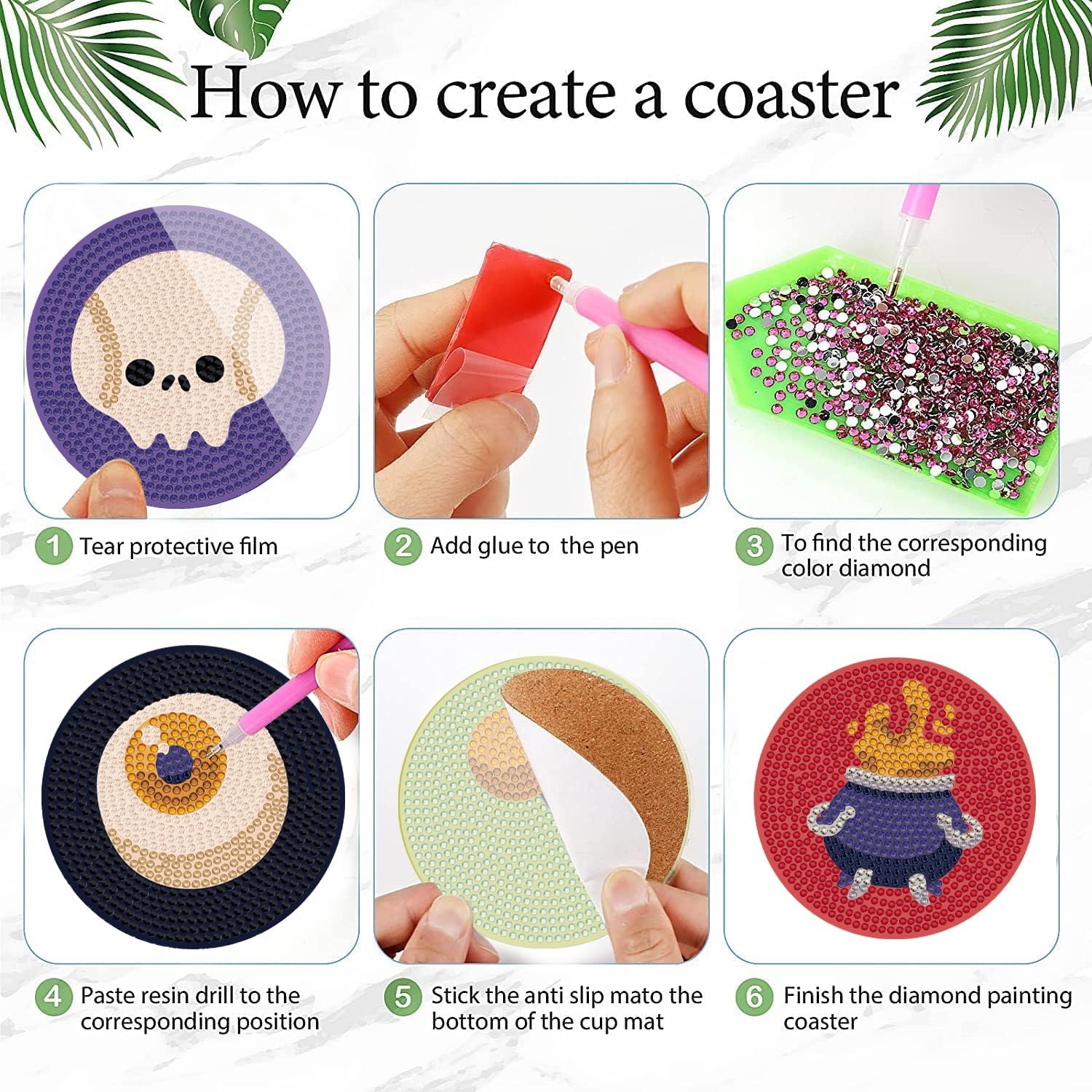 - Easy to Use - This Halloween diamond coasters kit includes all necessary tools to complete 8 coasters. Simply peel off the protective film on the coaster, find the rhinestones according to the numbers/letters on the coaster (corresponding numbers/letters are marked on the bags), and start creating. Finally, stick the cork pad on the back of the coaster. It's as easy as a paint by numbers kit for adults, making it a great addition to your arts and crafts collection.