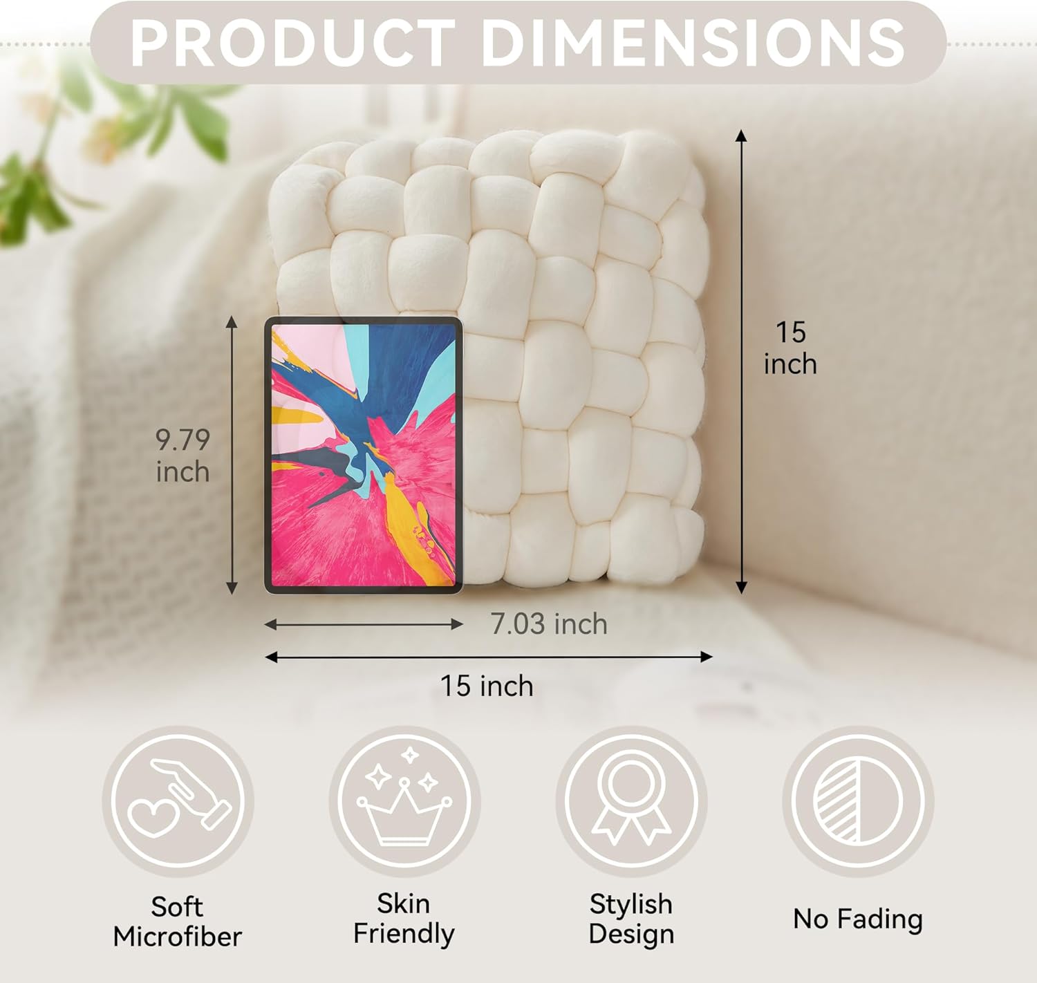 JELLYMONI White Square Knot Throw Pillow, Large Size Home Decorative Pillows, Decorative Ins Throw Pillows, Soft Velvet Knotted Decor for Bedroom, Living Room and Couch (L- 15"×15"×4", White)