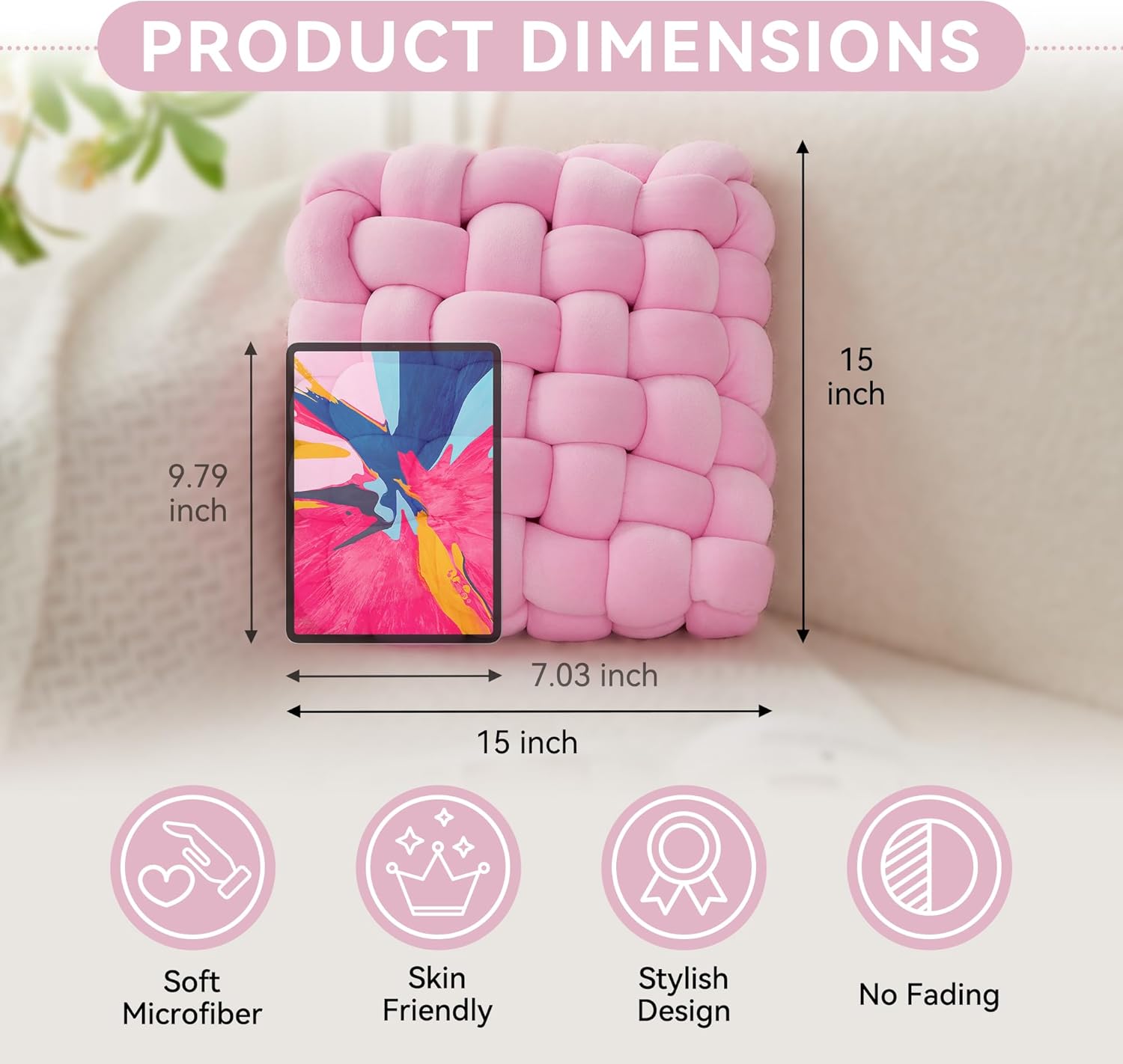 JELLYMONI Pink Square Knot Throw Pillow, Large Size Home Decorative Pillows, Decorative Ins Throw Pillows, Soft Velvet Knotted Decor for Bedroom, Living Room and Couch (L- 15"×15"×4", Pink)