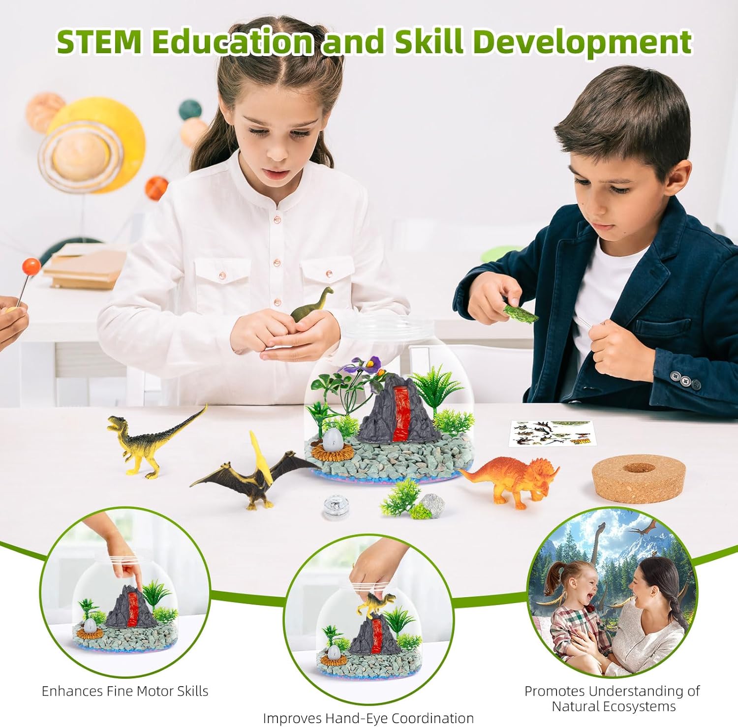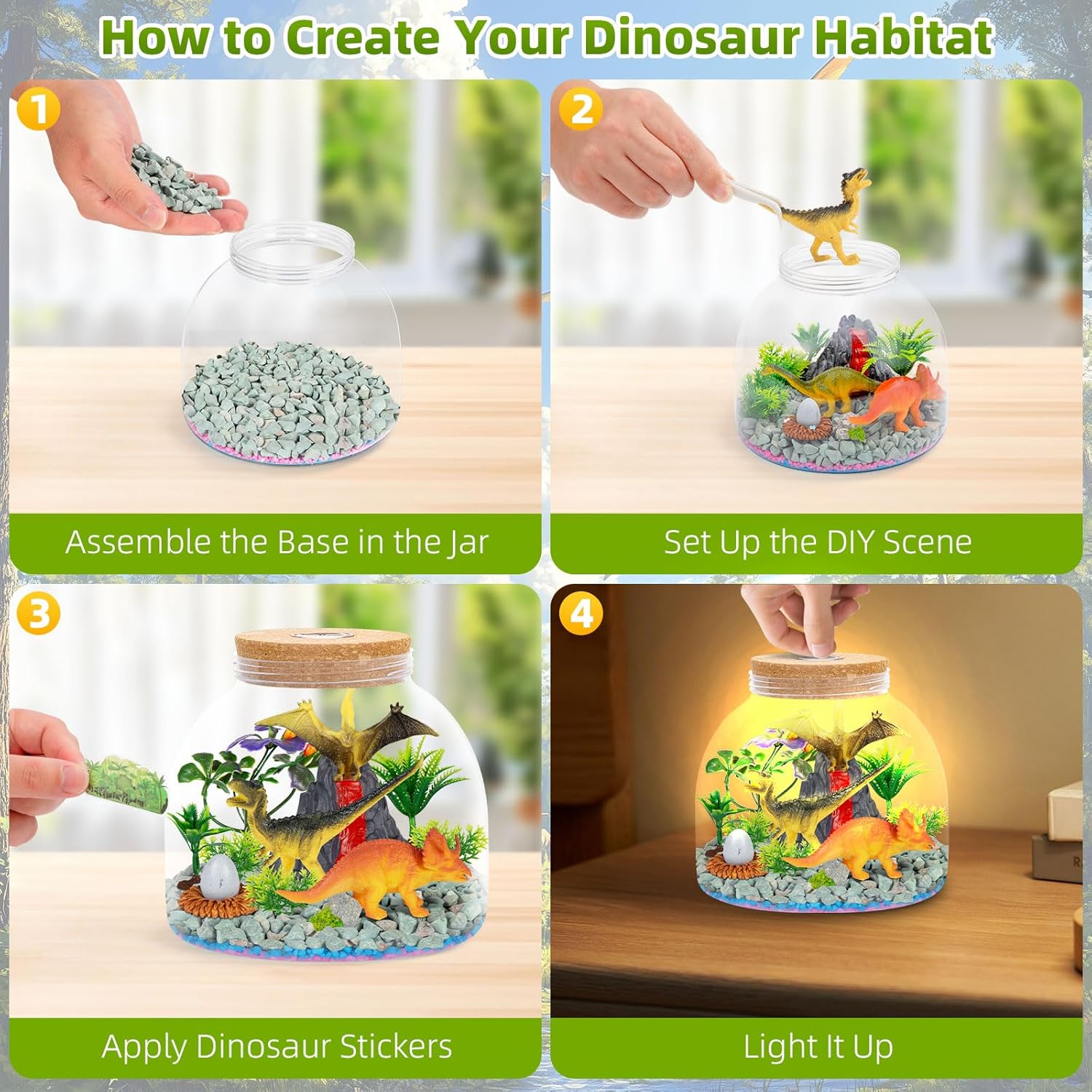 - Build Your Own Dinosaur World: Inspire creativity and imagination as kids assemble a realistic prehistoric habitat with dinosaur figures, a volcano, artificial plants, decorative stones, and stickers to personalize their terrarium