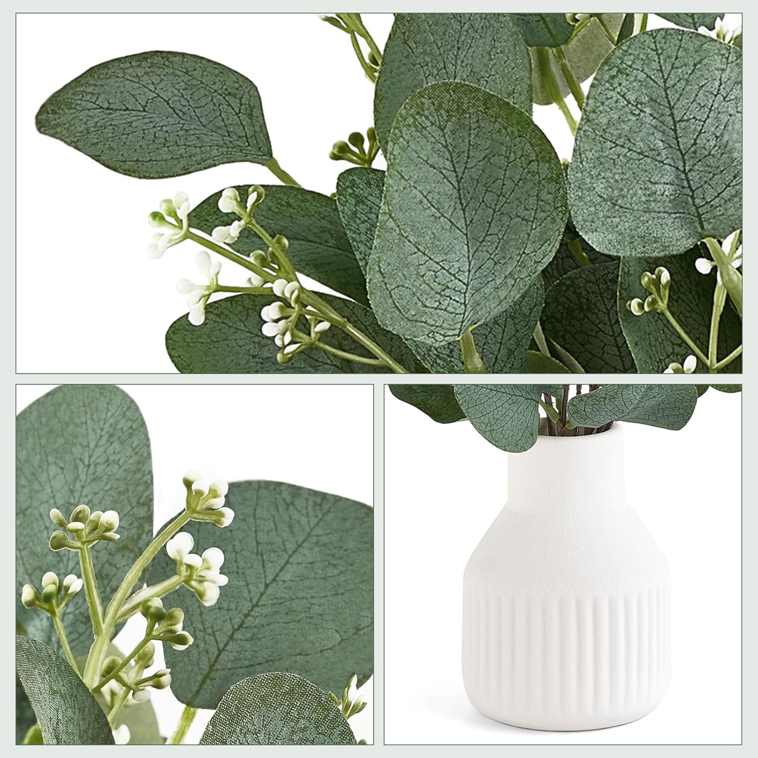 - Material: Fake Eucalyptus Leaves is made of high quality plastic, complex craftsmanship, clear texture, more realistic, with a high quality white ceramic vase, can add the vitality of nature for your home decor
