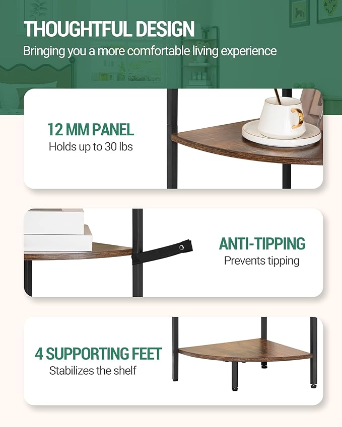 - [Sturdy Corner Shelves] Made of premium particle board and sturdy steel frames, our corner shelves are built to last, and this vertical bookshelf can hold up to 30 pounds per shelf, providing a long-lasting storage solution for your belongings