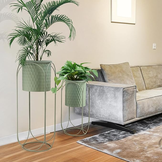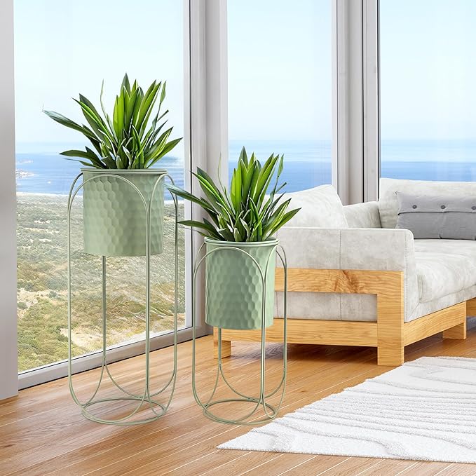 - MORDEN MINIMALIST DESIGN:Add a touch of sophistication to your room with this set of two metal planters that come with sturdy metal stands. The planters feature a sleek and modern design style that creates an elegant ambiance,and it will be an eye-catching decoration in your room.