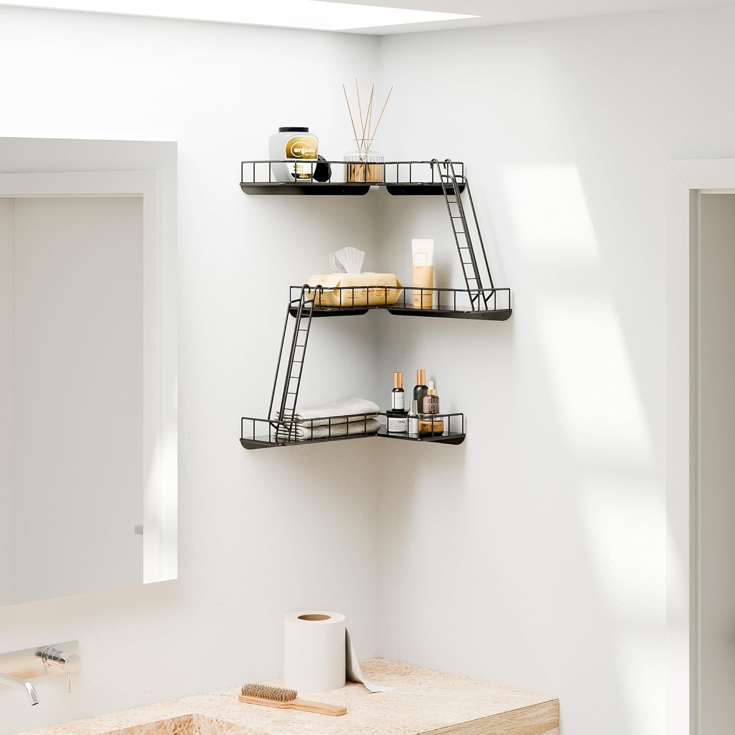 Fire Escape Wall Shelf - Modern City Style 3-Tier Corner Wall Shelves, Easy to Install Metal Ladder Shelf for Figures, New York Decorative Shelves for Bathroom, Living Room & Home Decor,Black
