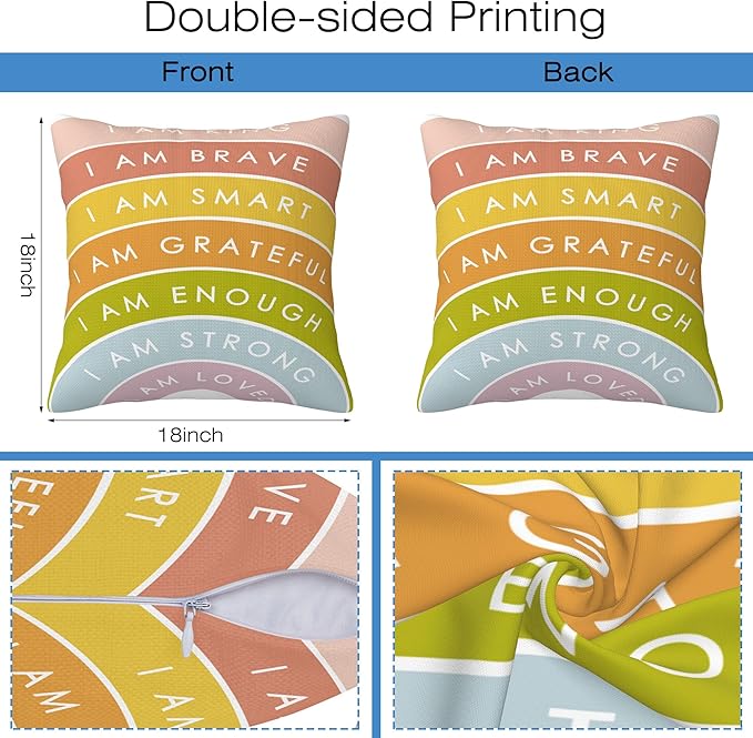 - IDEAL DECORATION:The throw pillow covers are printed on both sides,with smart printing technology to keep bright colors and soft texture.Positive Affirmations Inspirational throw pillow covers can be perfect for your friends or family to decor living room, bedroom, sofa, car seat, bench, office.