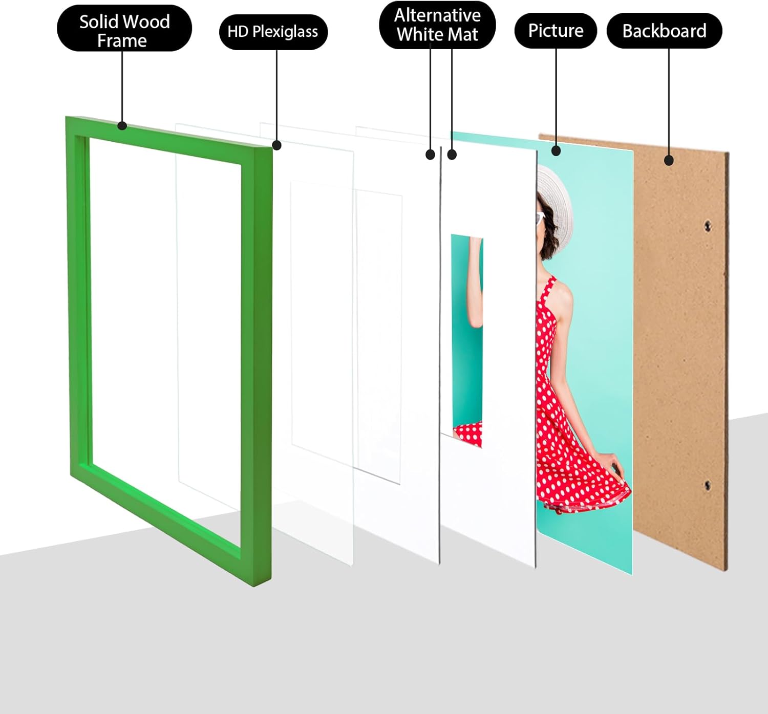 - SOLID WOOD: The light green 11x14 picture frame with mat is made of light weight, natural solid wood with transparent, non-toxic acrylic glass front that gives a clear view of your pictures and preserves your precious memories as well. The 11x14 frame green is worth noticing that remove the protective film on the glass before use.