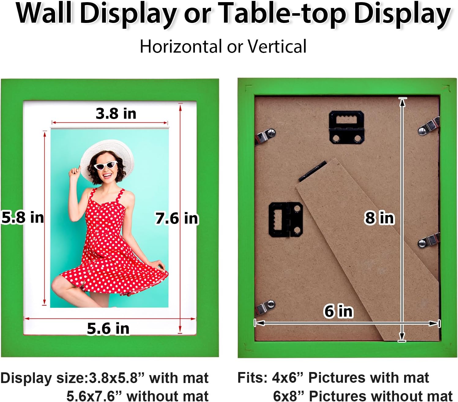 - SOLID WOOD: Kinlink green 6x8 photo frames are fitting for standard pictures 4x6 with mat and standard pictures 6x8 without mat. These 6x8 frames matted 4x6 are made of light weight solid wood, with transparent, non-toxic acrylic glass front that gives a clear view of your pictures and preserves your precious memories as well. It is worth noticing that remove the protective film on the glass before use.