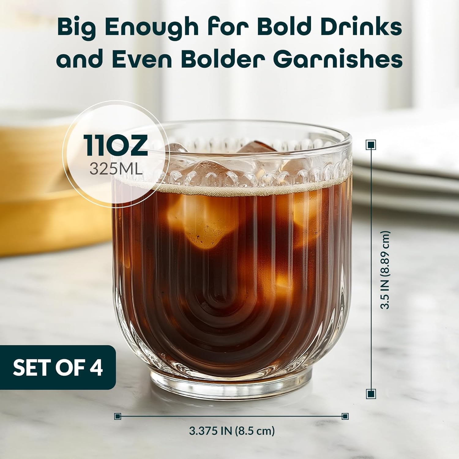 - 🔁VERSATILE: Our set of 4 glasses have a 11oz capacity that is perfect for a variety of drinks, including cocktails with ice, beer, mixed drinks, iced tea, coffee, smoothies, and everyday refreshing beverages. Glassware works for both casual dinners and elegant parties, making them a perfect addition to your vintage or modern drinkware collection.