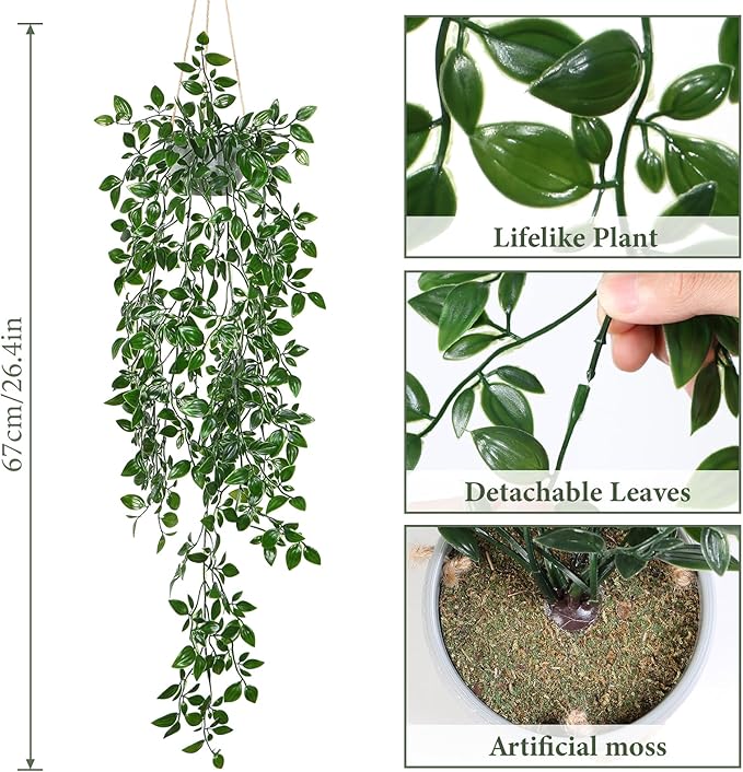 - 【Lifelike Artificial Hanging Plants with pot】Our fake hanging vines look like real preserved plants.Artificial shrubs plants in lush green sustain the sunlight of spring for you in any time,look so lifelike,no fall and never wilt. These artificial decorative plant objects will put you in nature.