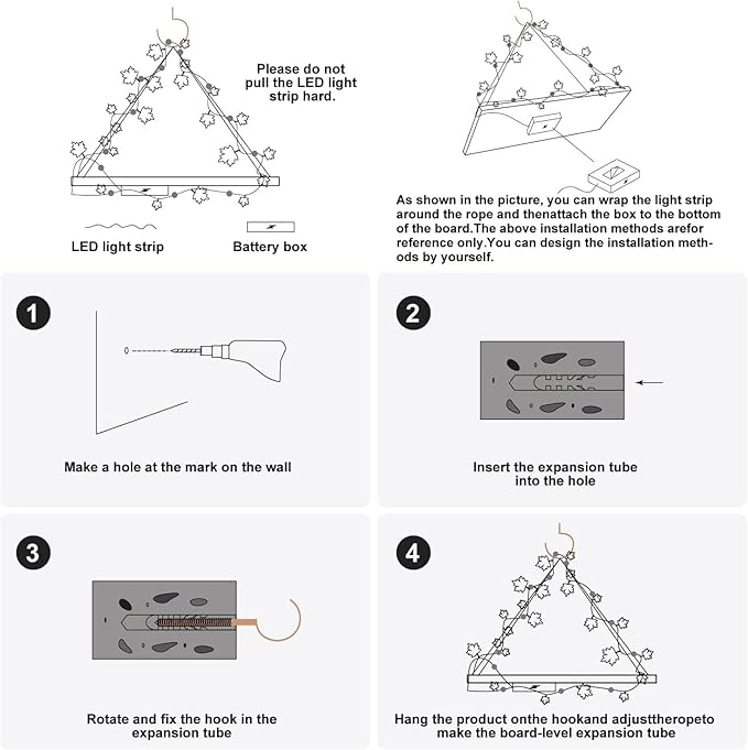 - What You Get - 2-Pack hanging rope shelf with a greenery-style LED strip (Not including batteries),Install the required wall anchors and metal hooks, a nano-adhesive for sticking the electromagnetic box to the shelf, and a piece of the clear instructions.