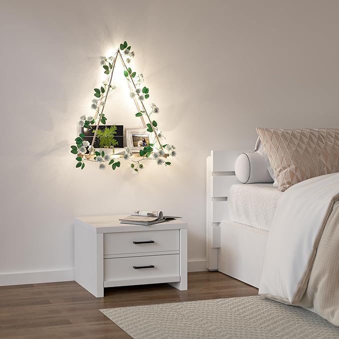 Triple Artificial White Flower Garland with LED-Strip Wall Hanging Shelves Set of 2, Boho Shelves for Wall Décor, Macrame Wall Shelf for Bedroom Bathroom Living Room Kitchen (No Battery Included)