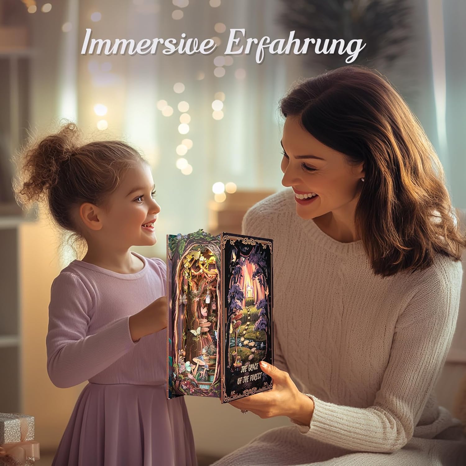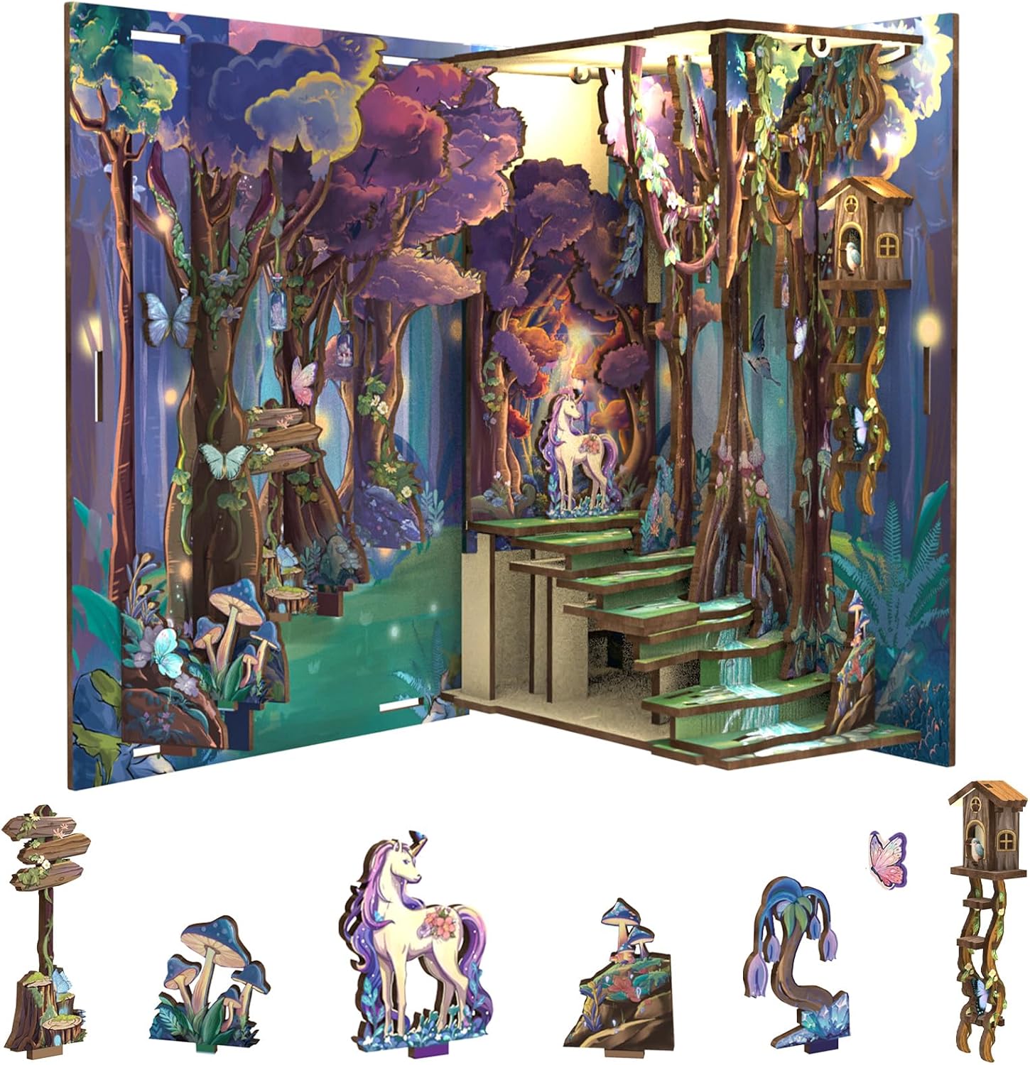 Cutefun Book Nook Kit, DIY Miniature Dollhouse Kit for Adults and Teens, 3D Wooden Puzzle Bookends, Bookshelf Insert Decor w/LED Light Dust Cover, Christmas Birthday Gifts (Forest Unicorn)